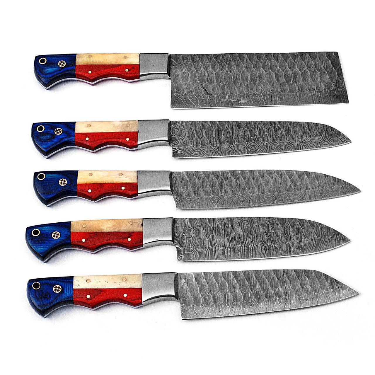 Professional Forged Damascus Chef Knife Set of 5 | Scalloped Blades Custom Made Cooking Kitchen Prep