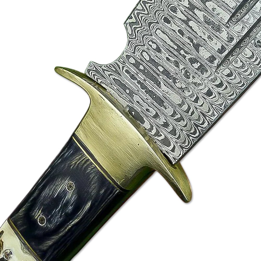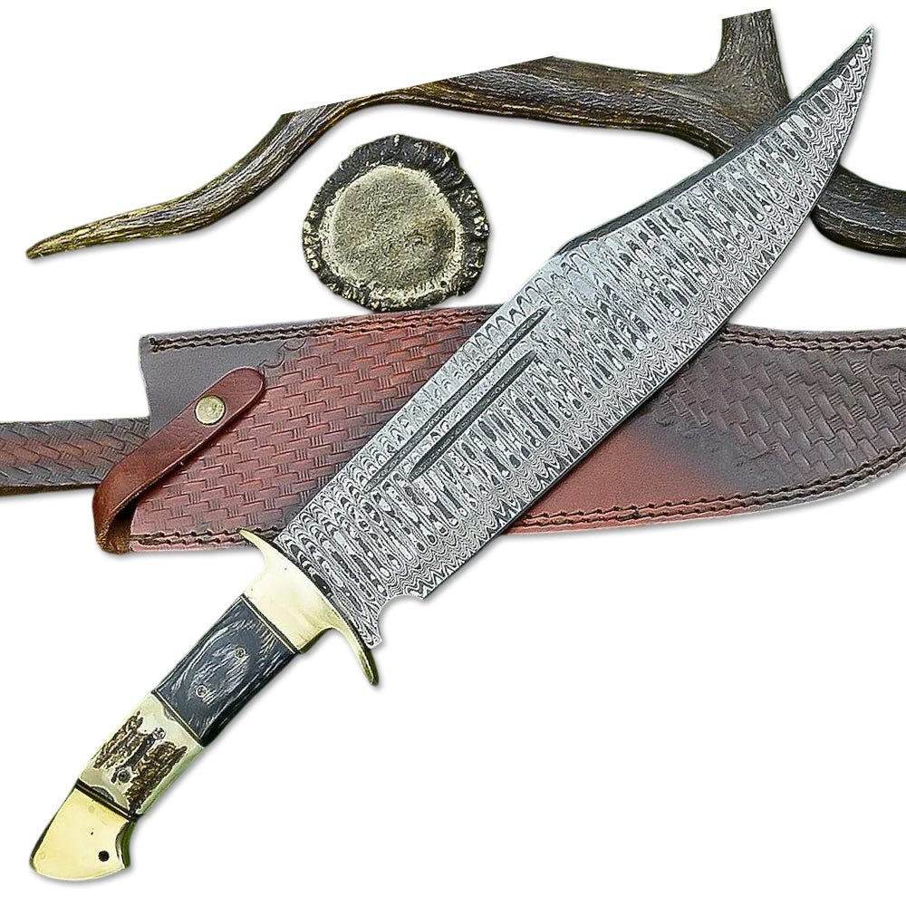 This 21-inch handcrafted Damascus steel knife is designed for both functionality and elegance. With a razor-sharp Damascus blade, a sturdy Stag Horn & Pakka Wood handle, and exquisite Brass Bolsters with Mosaic Pins, this knife is the perfect blend of strength and craftsmanship.