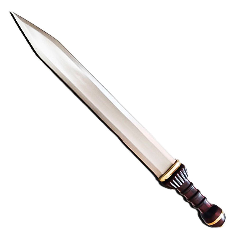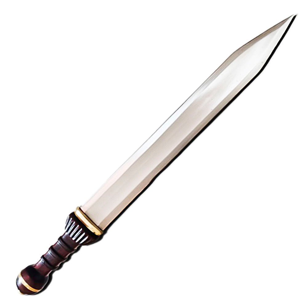The blade is double-edged with a sharp, pointed tip, designed for both slashing and thrusting, mimicking the effectiveness of ancient Roman short swords. The wooden handle, wrapped in genuine leather, provides a firm and comfortable grip, while the solid brass or steel guard and pommel enhance balance and historical appeal.