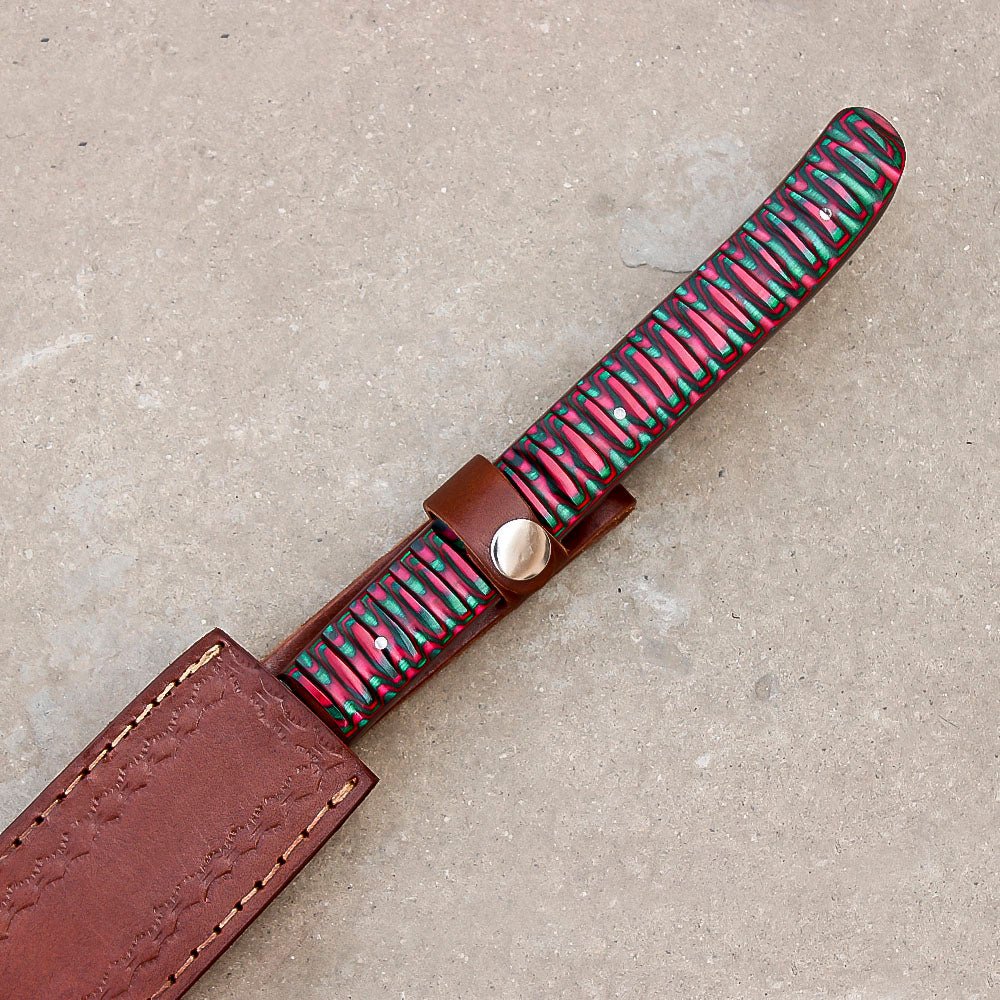 The handle is crafted for comfort and control, featuring a full tang construction that enhances stability and balance during extended use. Whether you’re deep in the forest or preparing game by the fire, this machete is your reliable companion. A custom-fitted leather sheath is included for safe storage and easy carry on your hunting or camping adventures.