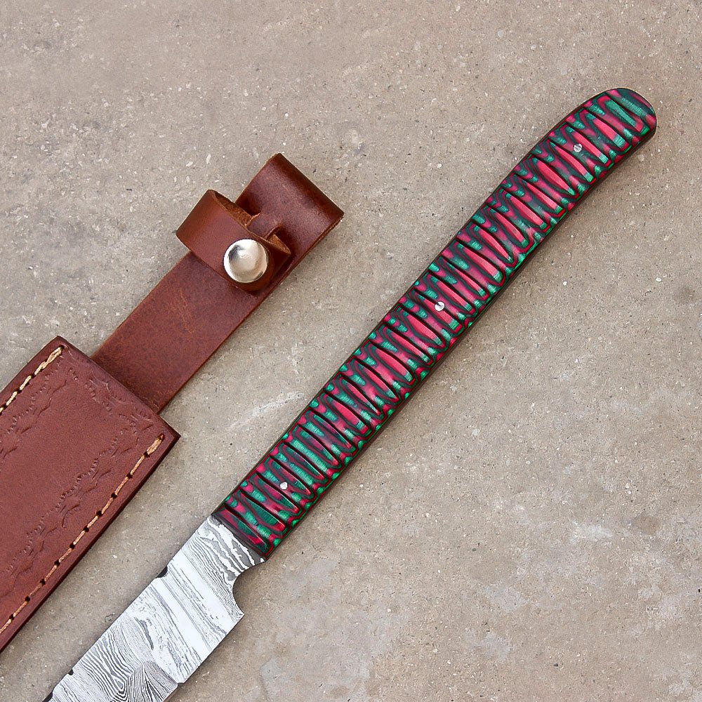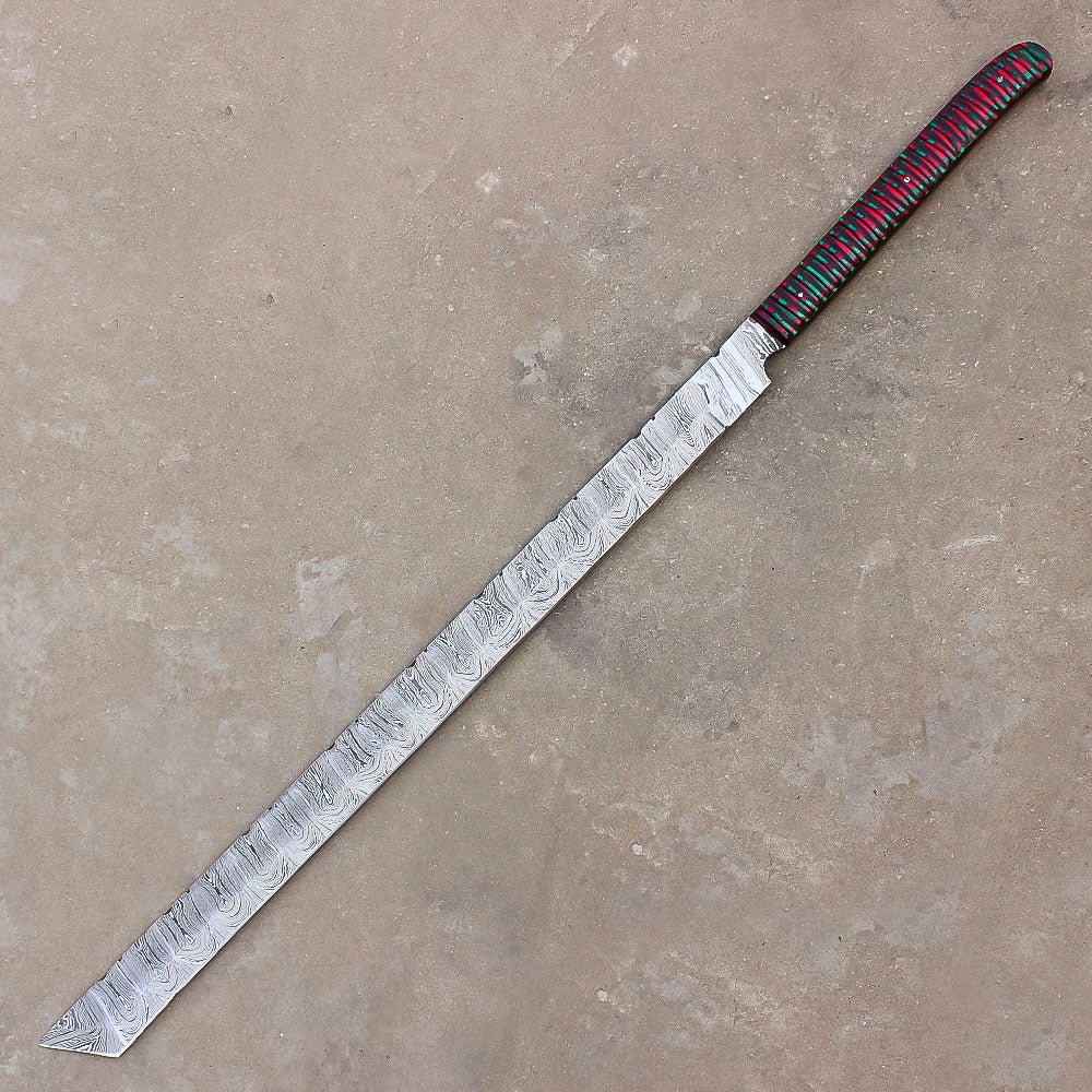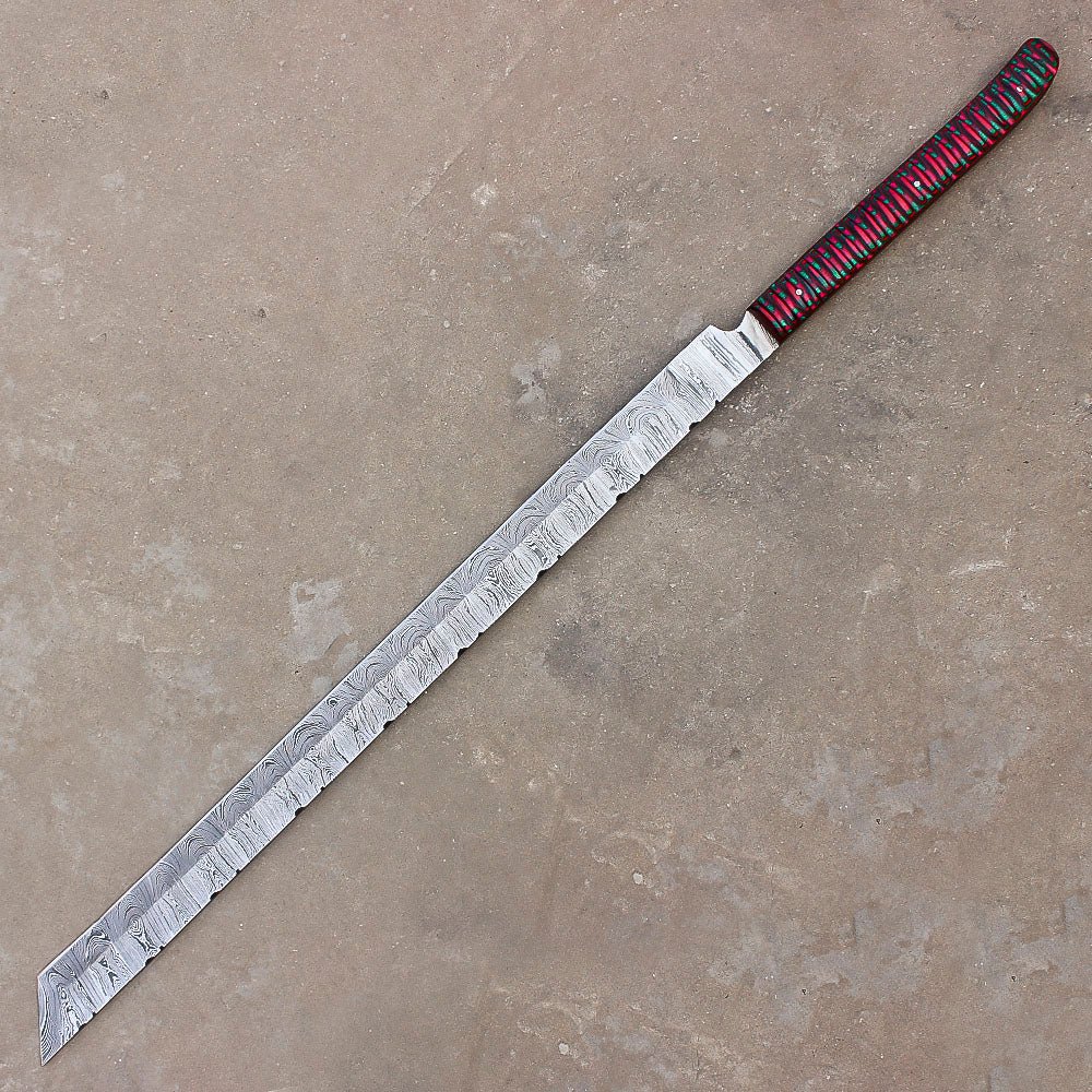 Built for the toughest wilderness challenges, this 28″ Handmade Damascus Steel Hunting Machete is a powerful tool designed to handle all your outdoor needs—from clearing brush to skinning game and preparing camp. Expertly hand-forged from layered Damascus steel, the blade delivers exceptional sharpness, durability, and edge retention, while its distinct wave-like patterns give it a bold, timeless aesthetic.