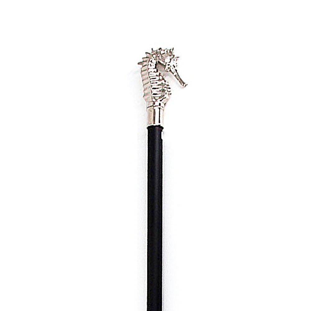 This Silver Luxury Hippocampus Sea Horse Handle Walking Sword Cane stands tall with realistic features. Hidden inside of the black metal shaft is a 12.25” hidden blade made of stainless steel, which can be accessed by unscrewing the handle. The shaft features a rubber foot for a slip-free grip when using it. This cane is strictly a fashion accessory for your costuming needs and should not be used as a medical device.