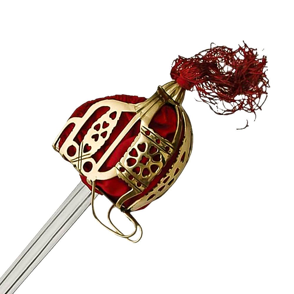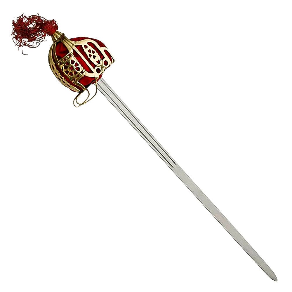This is a replica of an 18th century Scottish Broad Sword with great attention paid to the balance, ornate hilt, and sheath. The blade of the sword is stainless steel with an unsharpened edge. The scabbard of the sword is steel with two suspension rings. The guard is a basket hilt based off of the more ornate styles of the second quarter of the 17th century. The bars of the guard are almost 1/8 an inch thick with a full crossbar and golden ornate basket guard. Under the steel basket is a thick piece of red velvet that totally protects the hand. The pommel of the sword is ornately made from golden steel with a capstan rivet at the end. The pommel ends with a red tassel. The overall length of the Scottish Broad Sword is 41 inches and the blade has a double blood groove.
