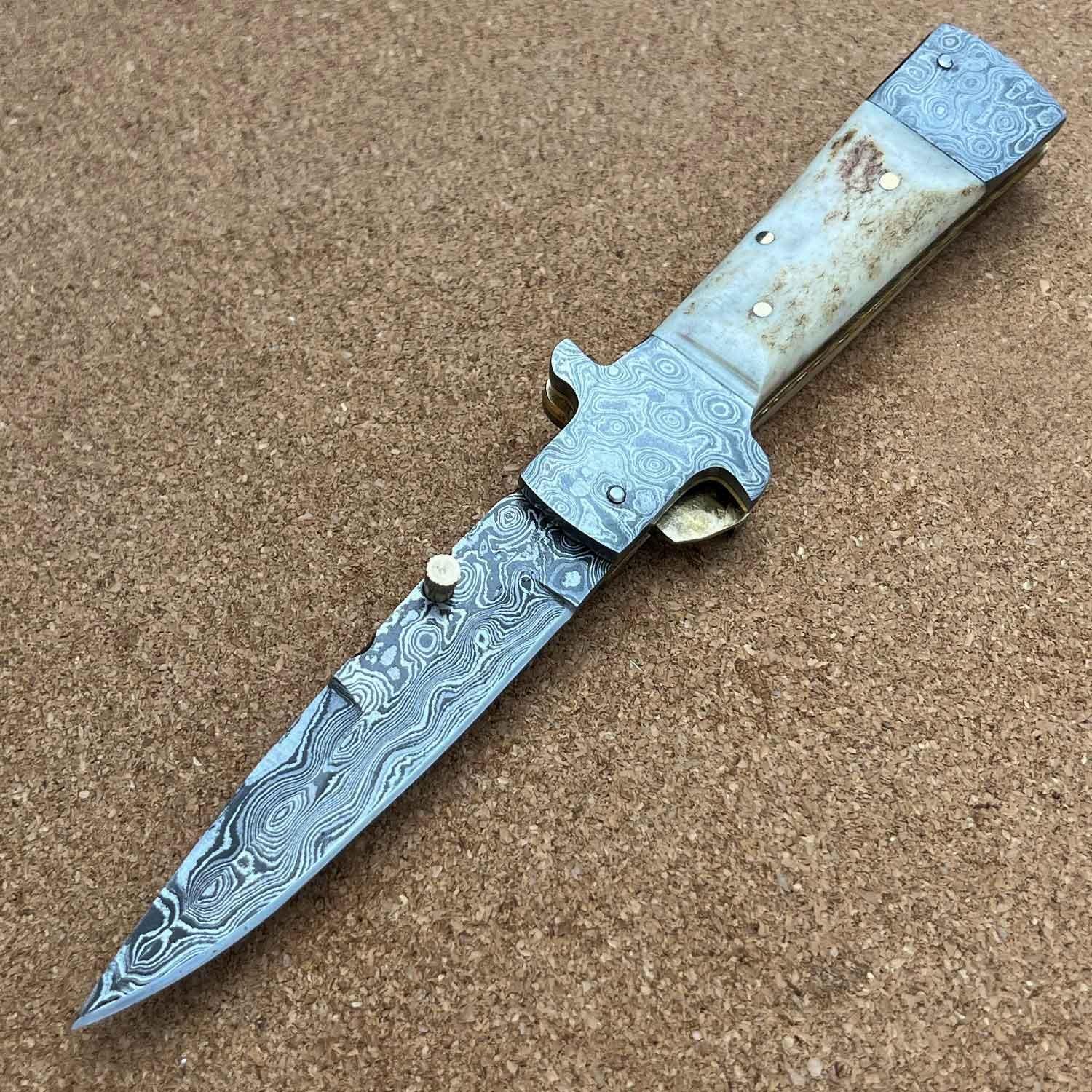 The Damascus Steel Pocket Knife features a finely contoured wood handle plate with Damascus bolsters. This spear point’s blade technique is characterized by distinctive patterns. Brass pins hold the handle together for durable long lasting use. A brass liner locking mechanism ensures the blade will always stay in place with brass walls. This knife comes with a tooled leather sheath with a snap closure for holding the handle in place and a belt loop featuring two reinforcing studs for a sturdy hold.