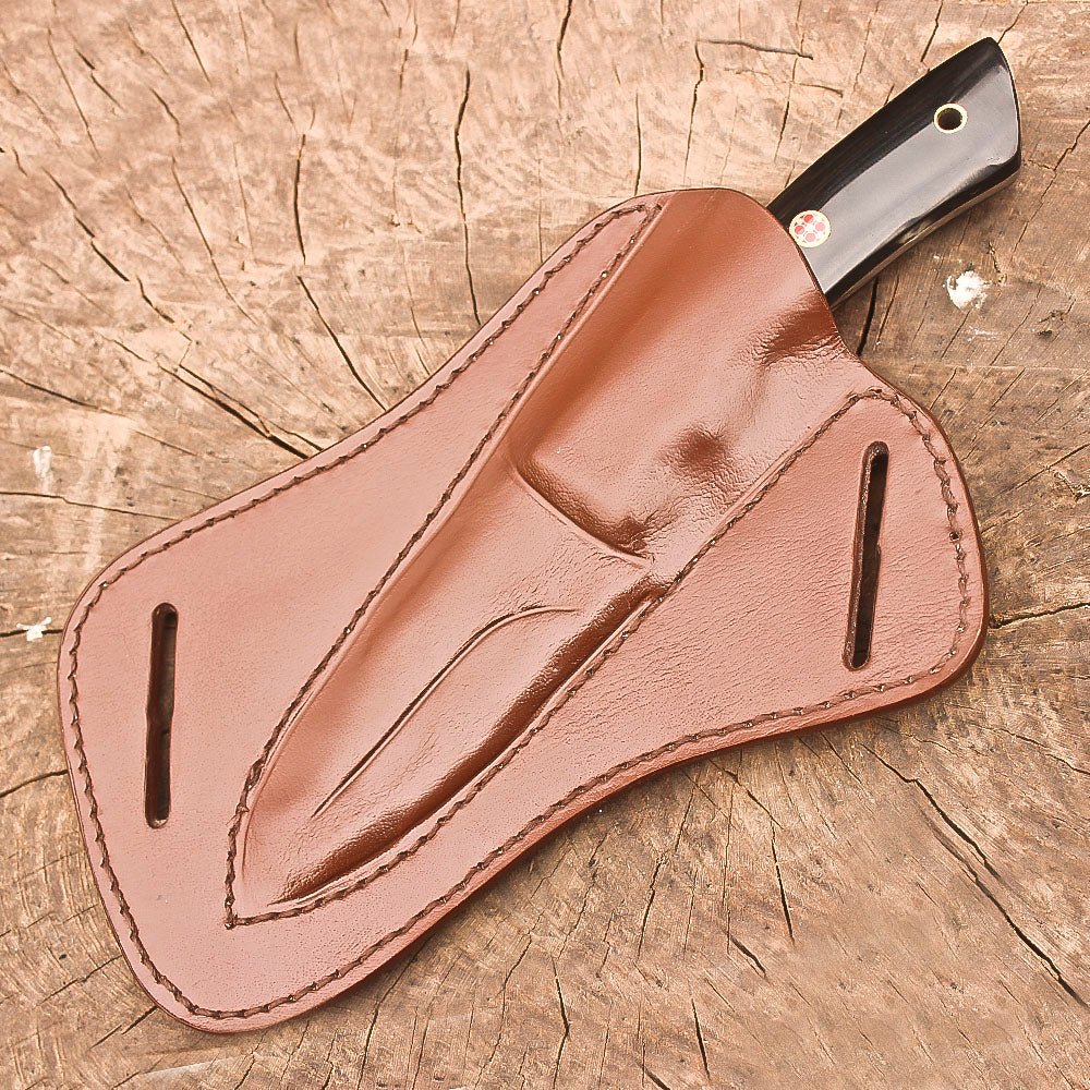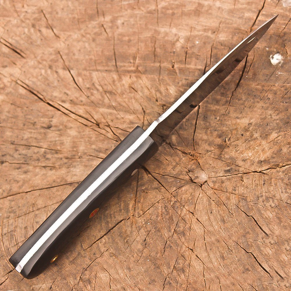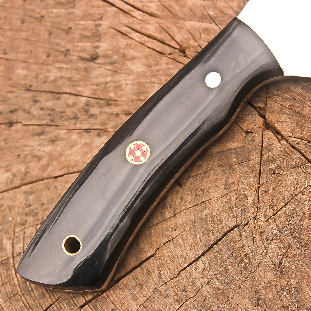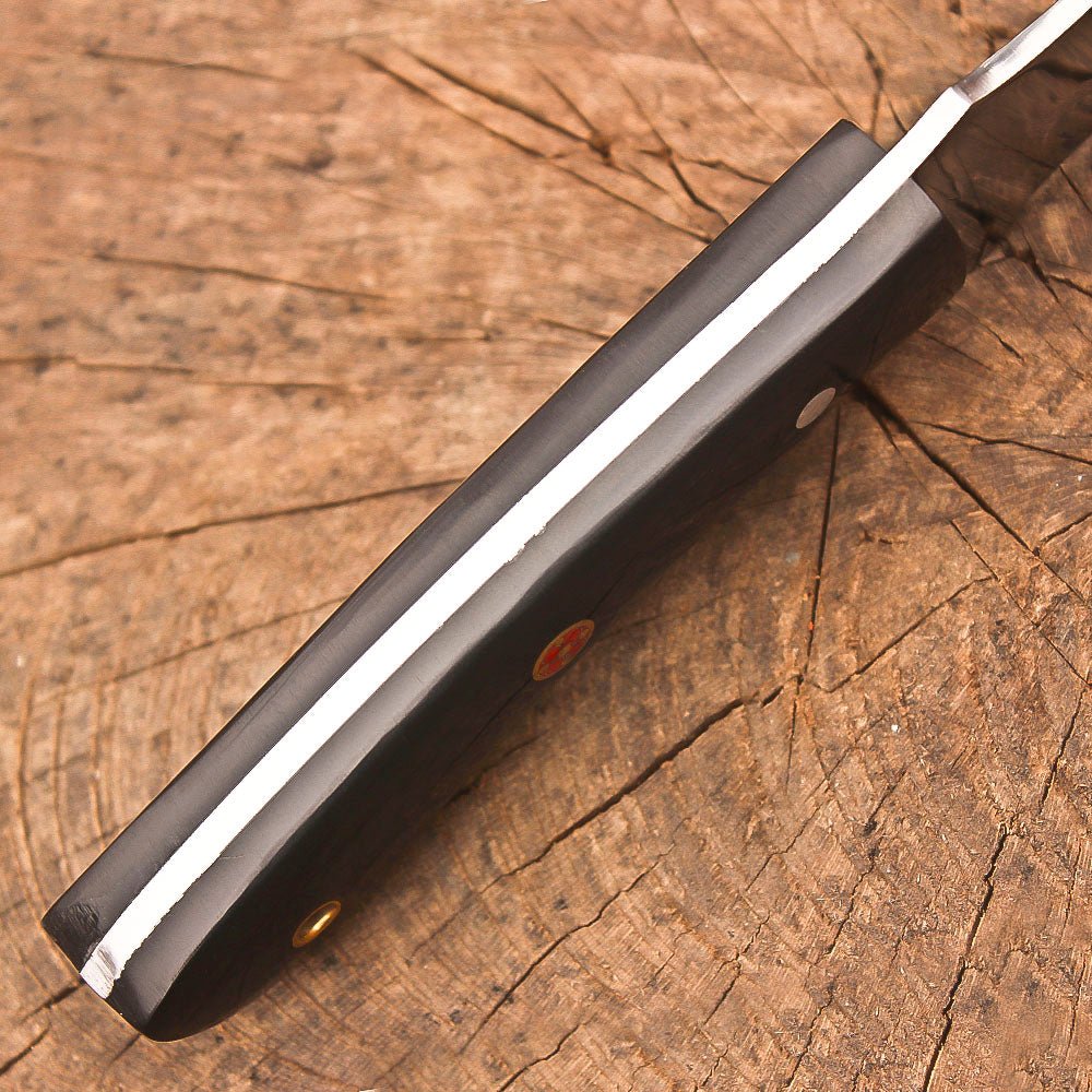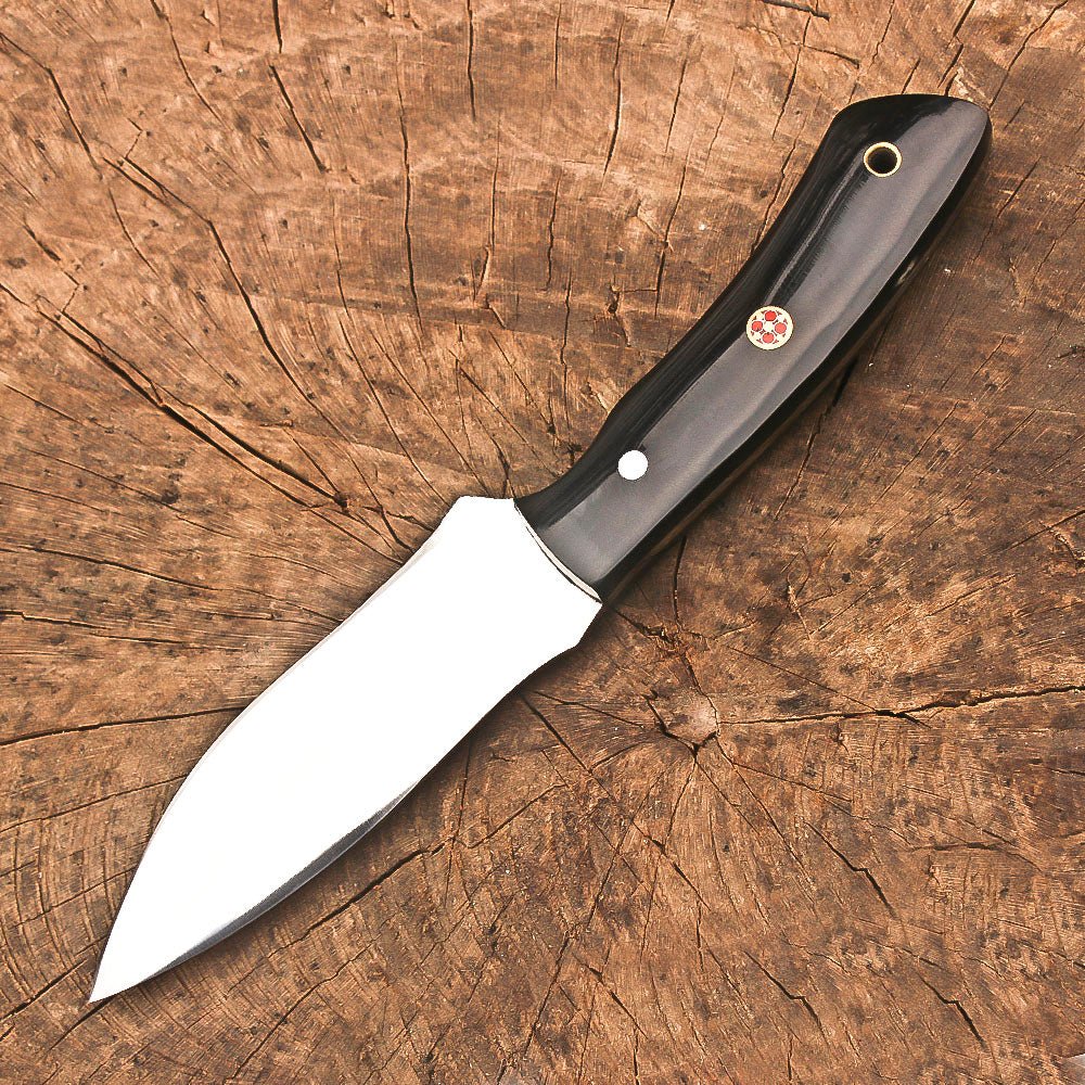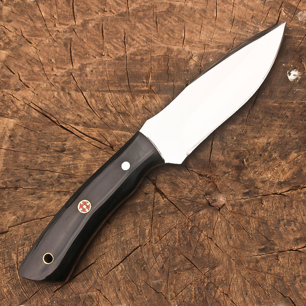 This premium 9-inch full tang hunting knife combines exceptional craftsmanship with practical functionality. The sleek black resin handle provides a secure grip and features a convenient lanyard hole for added versatility. The stainless steel blade showcases expert handcrafting, making it ideal for skinning and bushcraft activities. At 4.5 inches, the blade length offers precise control for detailed work, while the full tang construction ensures maximum durability and strength. The knife comes complete with a handsome brown leather sheath, featuring detailed stitching and a classic design that protects the blade while allowing quick access. Perfect for outdoor adventures, camping trips, and survival situations, this knife delivers reliable performance when you need it most. The thoughtful design balances traditional aesthetics with modern materials, creating a tool that’s as functional as it is attractive. The quality construction and attention to detail make this knife a dependable companion for outdoor enthusiasts and hunters alike.