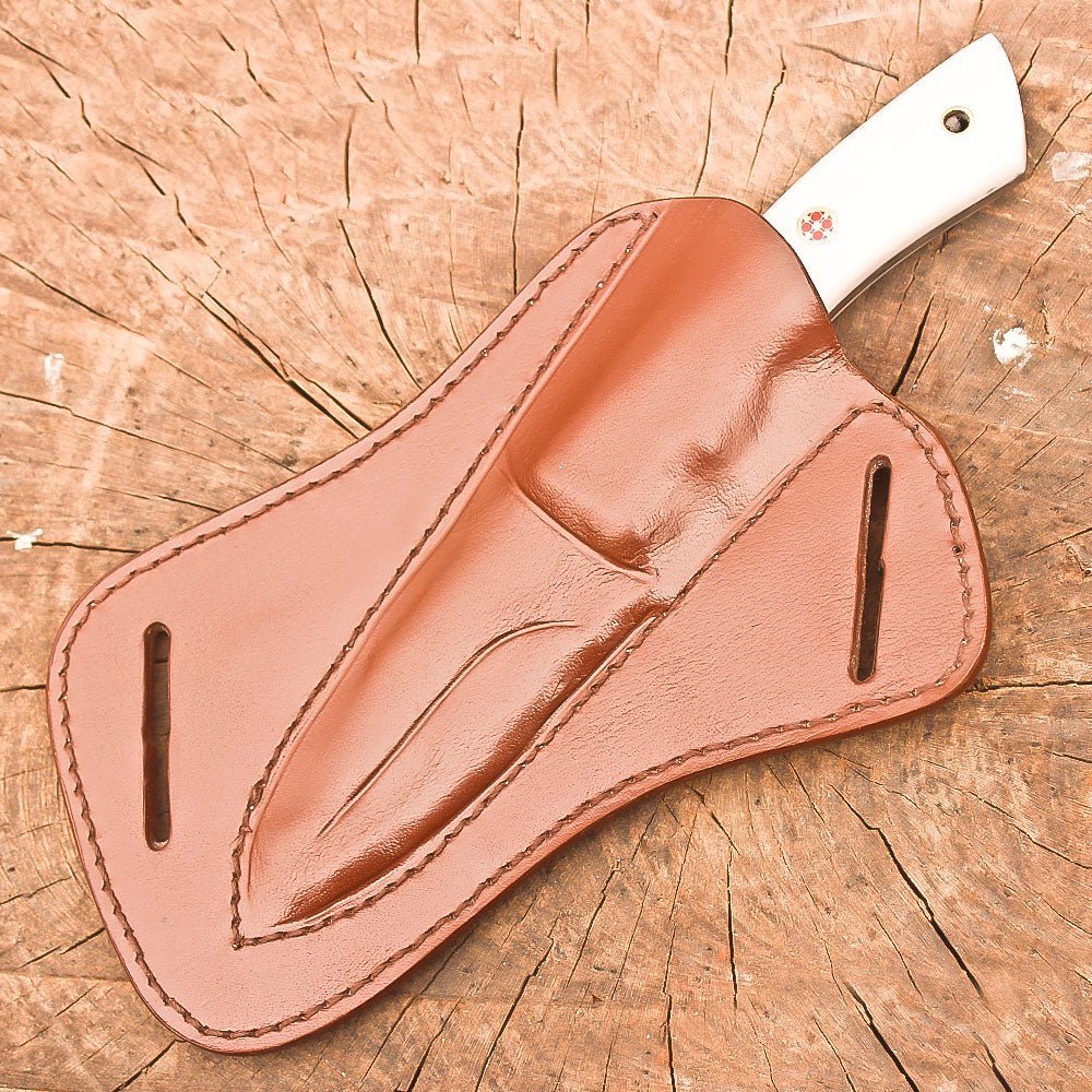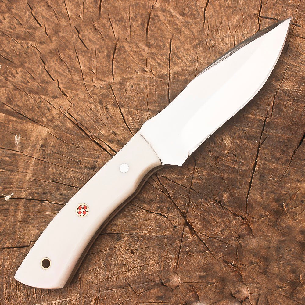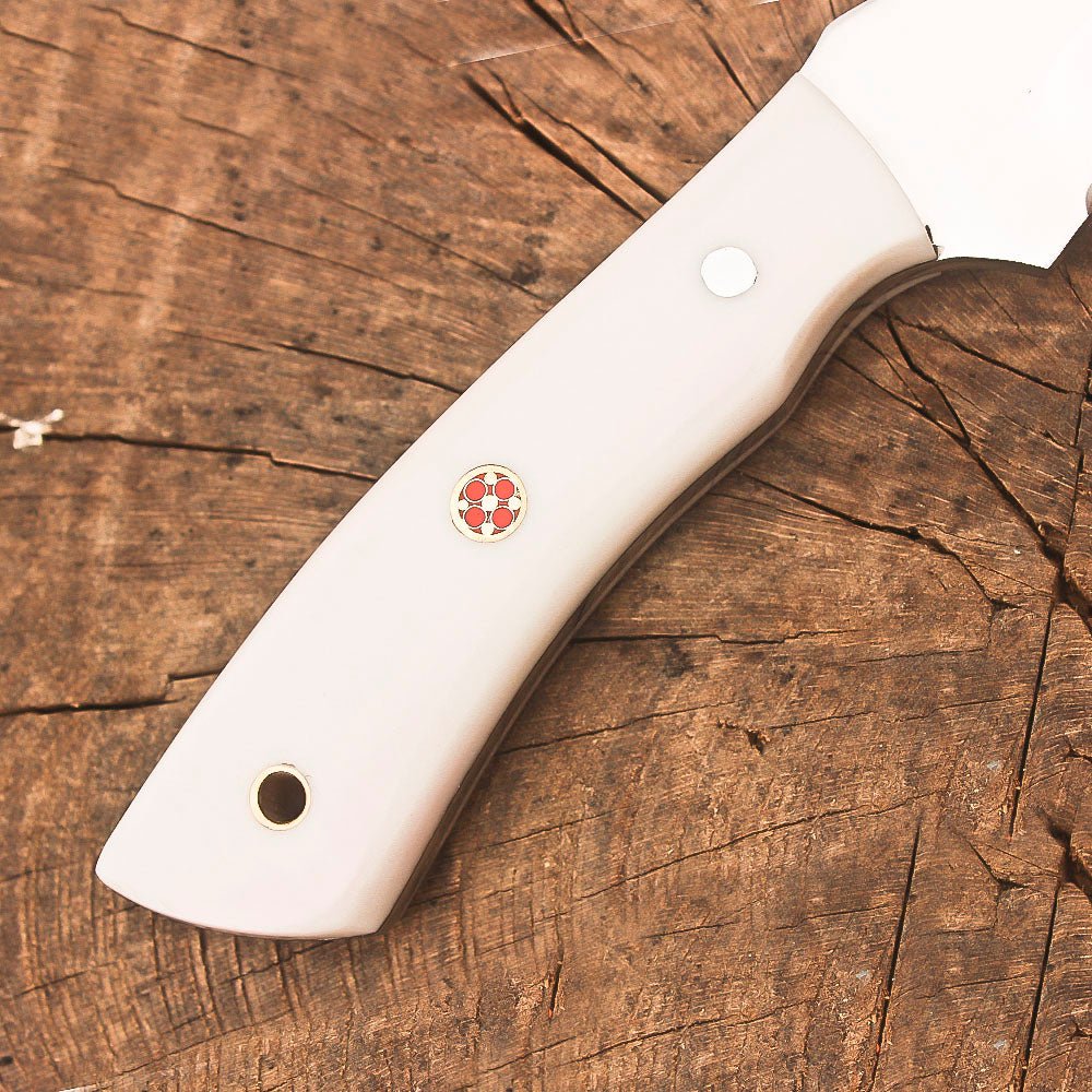 Handmade stainless steel 9-inch fixed blade hunting knife. Crafted with precision, this full tang skinner features a premium stainless steel blade that maintains its edge and resists corrosion. The white resin handle provides excellent grip and control during use, while its ergonomic design ensures comfortable handling during extended periods. The knife comes complete with a beautifully crafted leather sheath, featuring detailed stitching and a secure fit for safe carrying. Perfect for bushcraft, hunting, camping, and survival activities, this versatile knife is built to handle demanding outdoor tasks. The full tang construction extends through the entire handle, delivering exceptional durability and strength for reliable performance in challenging conditions. Whether you’re field dressing game, preparing camp, or handling general outdoor cutting tasks, this knife is ready for action. The classic design combines functionality with rugged elegance, making it a dependable companion for outdoor enthusiasts.