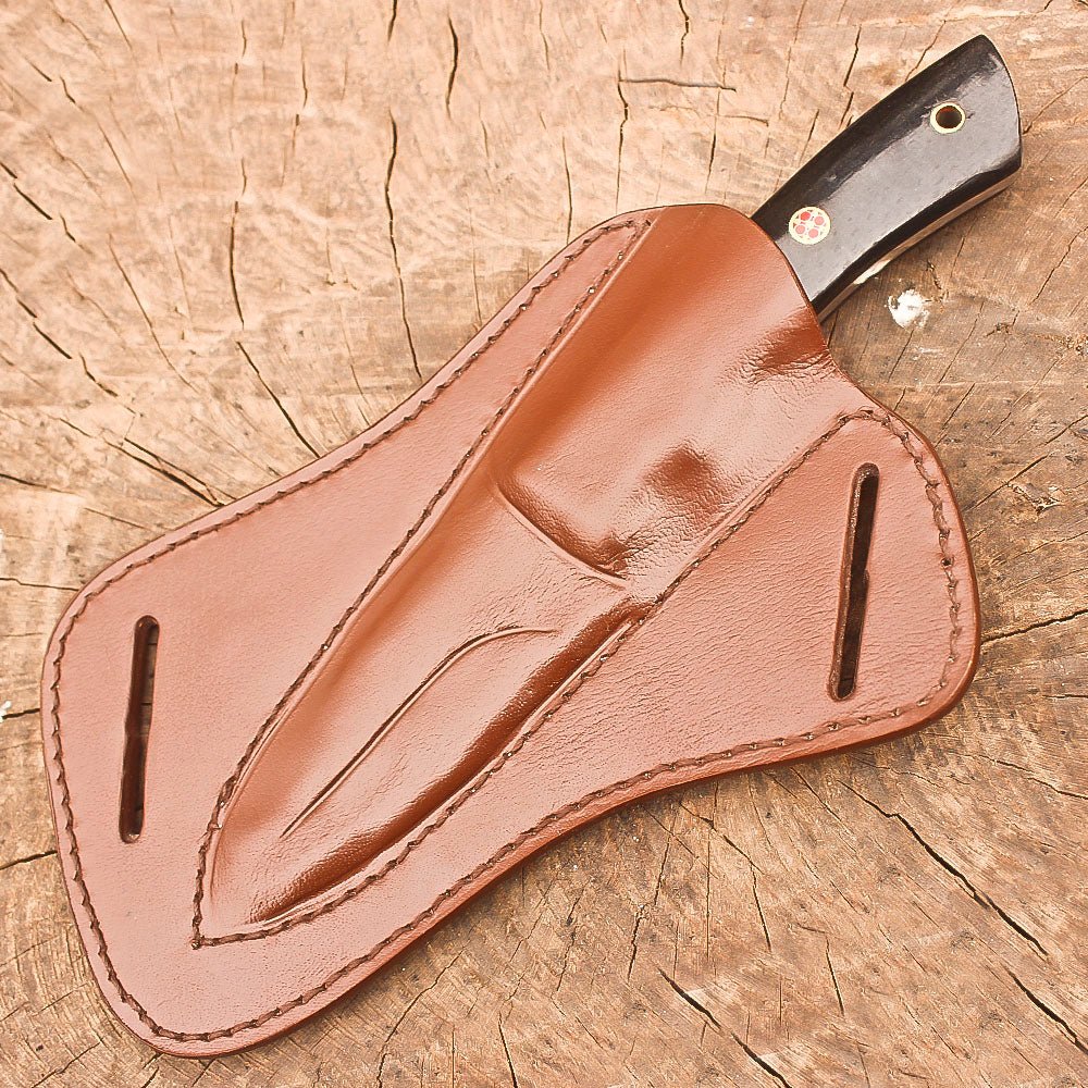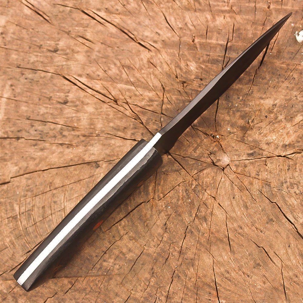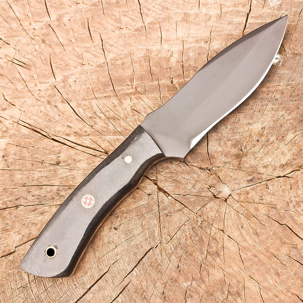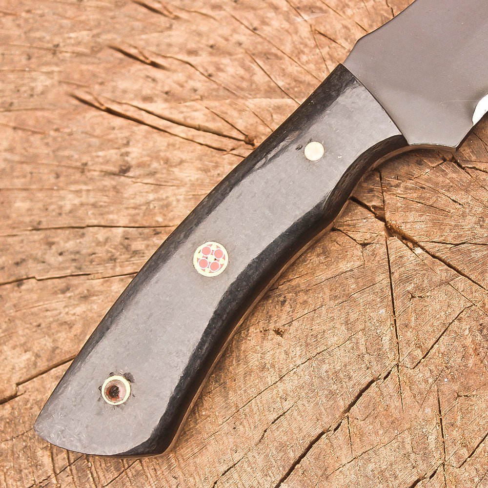 Handmade stainless steel 9-inch fixed blade hunting knife, designed for the serious outdoorsman. The full tang construction provides exceptional durability and balance, while the premium stainless steel blade delivers precise skinning and bushcraft capabilities. The ergonomic black Micarta handle offers a secure, comfortable grip in all weather conditions, making it ideal for extended use in the field. This versatile knife comes complete with a quality leather sheath for safe carrying and easy access. Whether you’re processing game, setting up camp, or handling survival tasks, this robust knife is ready for action. The carefully designed blade profile excels at skinning tasks while maintaining versatility for general outdoor use. At 9 inches in total length, it strikes an ideal balance between substantial cutting power and practical portability. The knife’s thoughtful design and quality materials make it an essential companion for hunting expeditions, camping trips, and wilderness adventures.