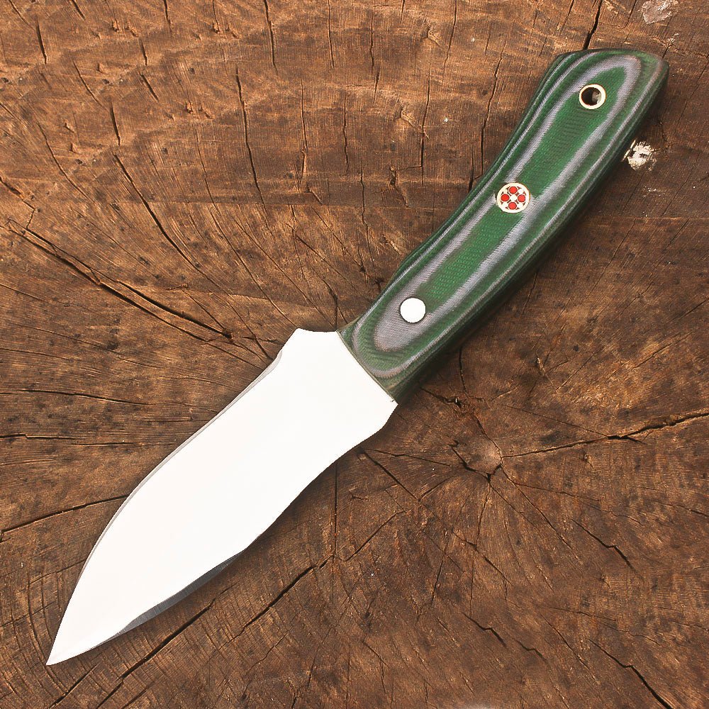 Handmade stainless steel 9-inch fixed blade hunting knife. Crafted with a full tang stainless steel construction, this skinner knife delivers exceptional durability and balance for all your outdoor adventures. The ergonomic green Micarta handle provides a secure, comfortable grip in any weather condition, while the carefully designed blade profile excels at skinning and general bushcraft tasks. The knife comes complete with a handcrafted leather sheath featuring precise stitching and a practical design for secure carry and easy access. Whether you’re processing game, setting up camp, or handling survival tasks, this versatile fixed blade knife is ready to perform. The robust construction and thoughtful design make it an essential companion for hunters, outdoor enthusiasts, and wilderness explorers. The substantial 9-inch size offers the ideal combination of control and cutting power for demanding outdoor use.