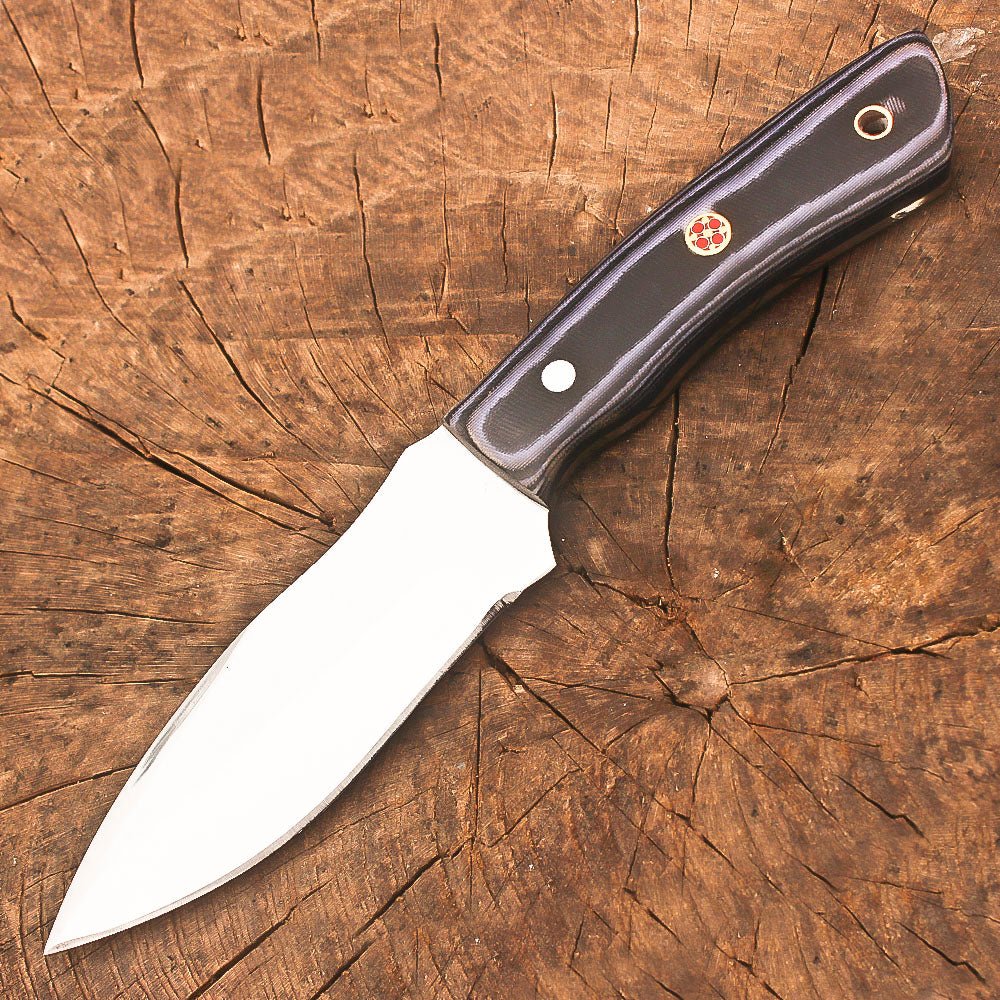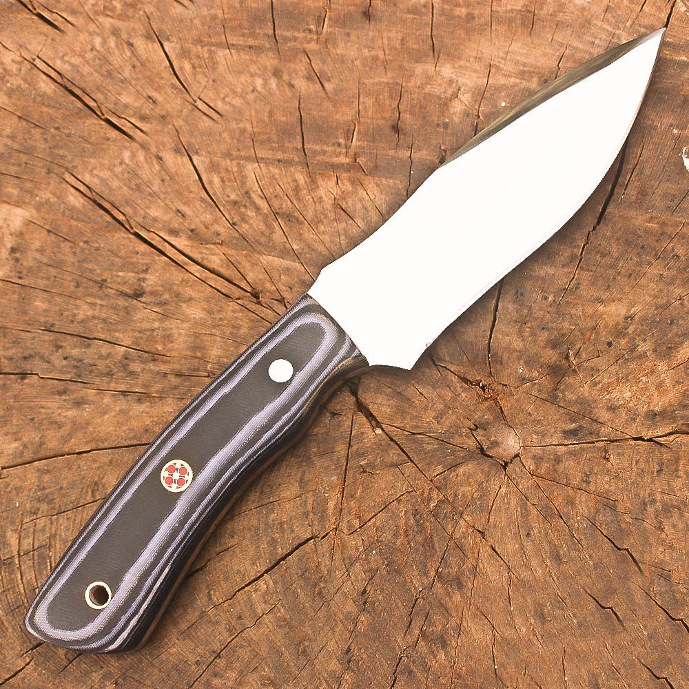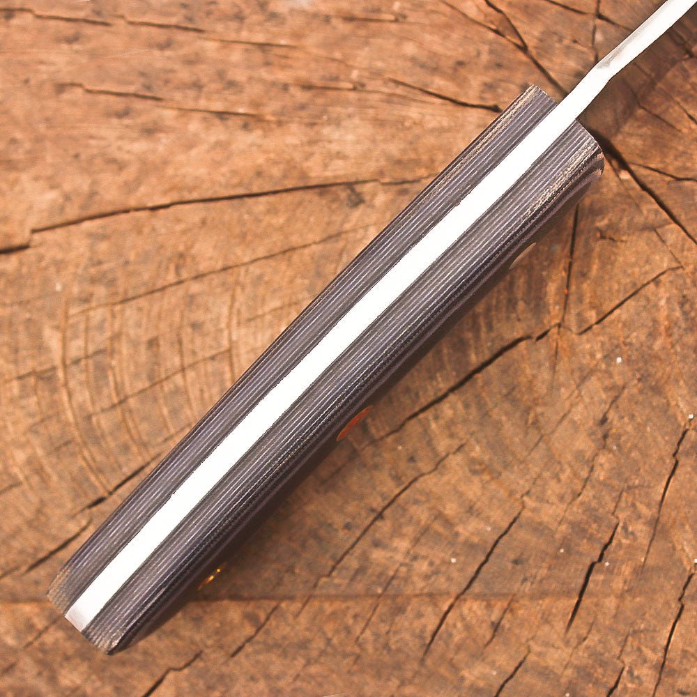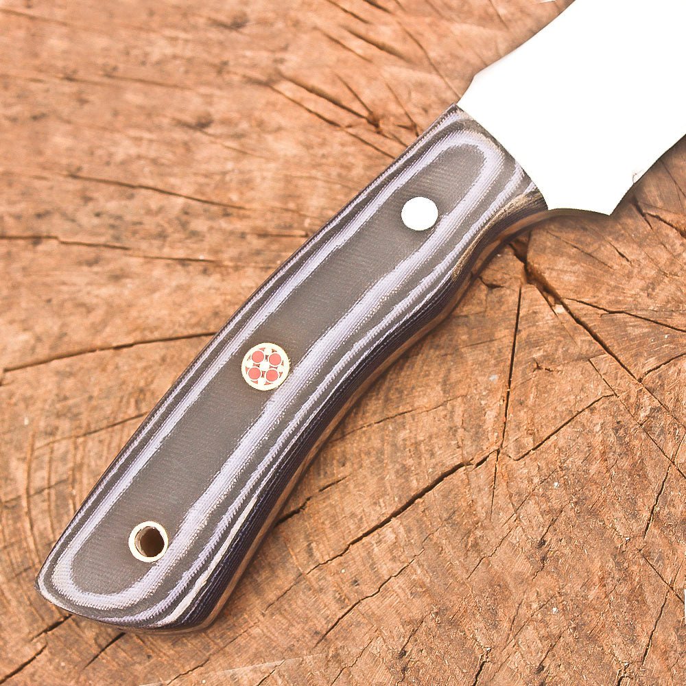 Handmade stainless steel 9-inch fixed blade knife. Crafted with a full tang stainless steel construction, this skinner knife delivers exceptional strength and reliability for all your bushcraft needs. The elegant grey Micarta handle provides a secure, comfortable grip in any weather condition, while the expertly designed blade profile excels at skinning and general outdoor tasks. The knife comes complete with a handcrafted leather sheath, featuring precise stitching and a practical design for secure carry and easy access. Whether you’re camping, hunting, or engaging in survival activities, this robust knife is ready to tackle demanding cutting tasks. The substantial 9-inch size offers versatility for both precision work and heavy-duty cutting. The full tang construction extends through the entire handle, ensuring maximum durability and control during use. This knife represents the perfect balance of traditional craftsmanship and modern materials, making it an essential tool for outdoor enthusiasts.