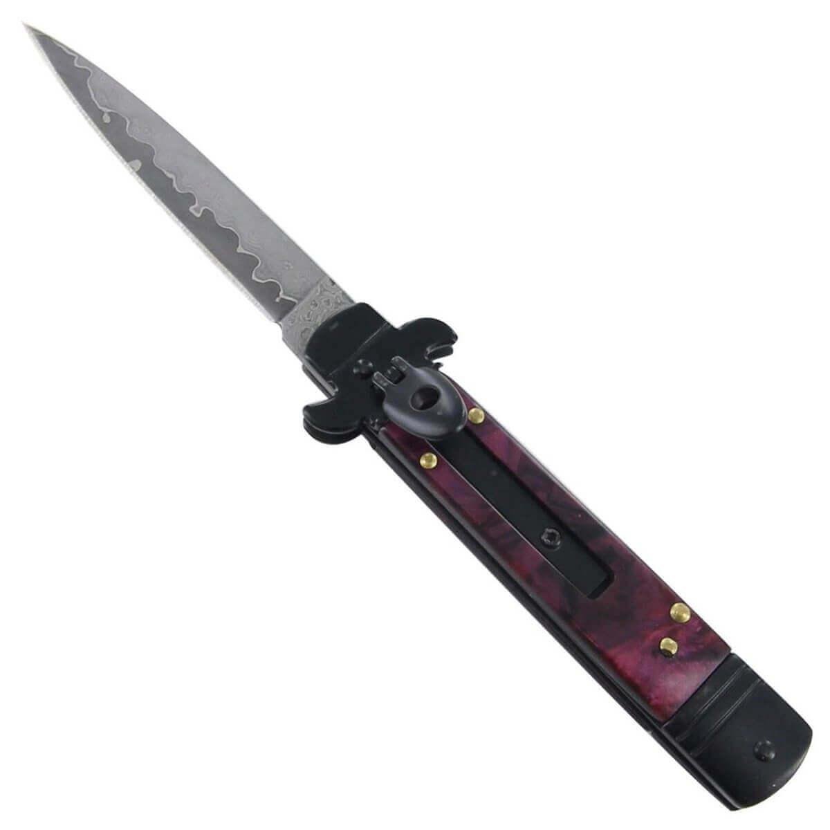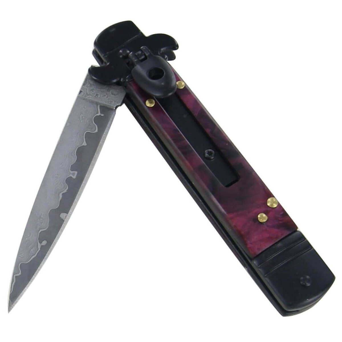 This sharp edge is produced using Damascus steel comprising of 1095/15N20 treated steel. This blade is perfect assuming you need an exemplary switchblade configuration that is as yet usable for regular errands. The cutting edge tells the truth edge. The supports on the handle are dark and matched with a twirled merlot and dark marble plan. The two mounts are produced using a sturdy ABS and kept intact with metal pins. The edge fires hard and secures tight. Included is a nylon sheath. This staggering plan is both exquisite and tough simultaneously.