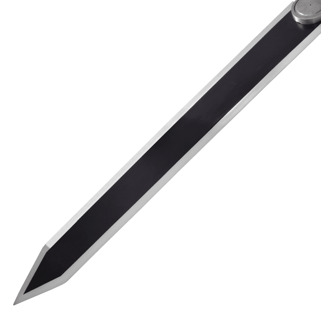 The Guts Dragon Slayer Sword is now available in a dual-tone finish. The blade is painted black in the middle and is silver towards the edges. The long stainless steel blade is thick enough and is double-edged. The blade is slightly sharp with a pointed tip. Made like a gigantic broadsword, this replica has a solid metal guard and a long handle to support dual-hand wielding. The comfortable grip is mainly possible due to the white wrapping over the handle. A perfect-fit synthetic leather sheath and a wooden display stand are also included in the package.