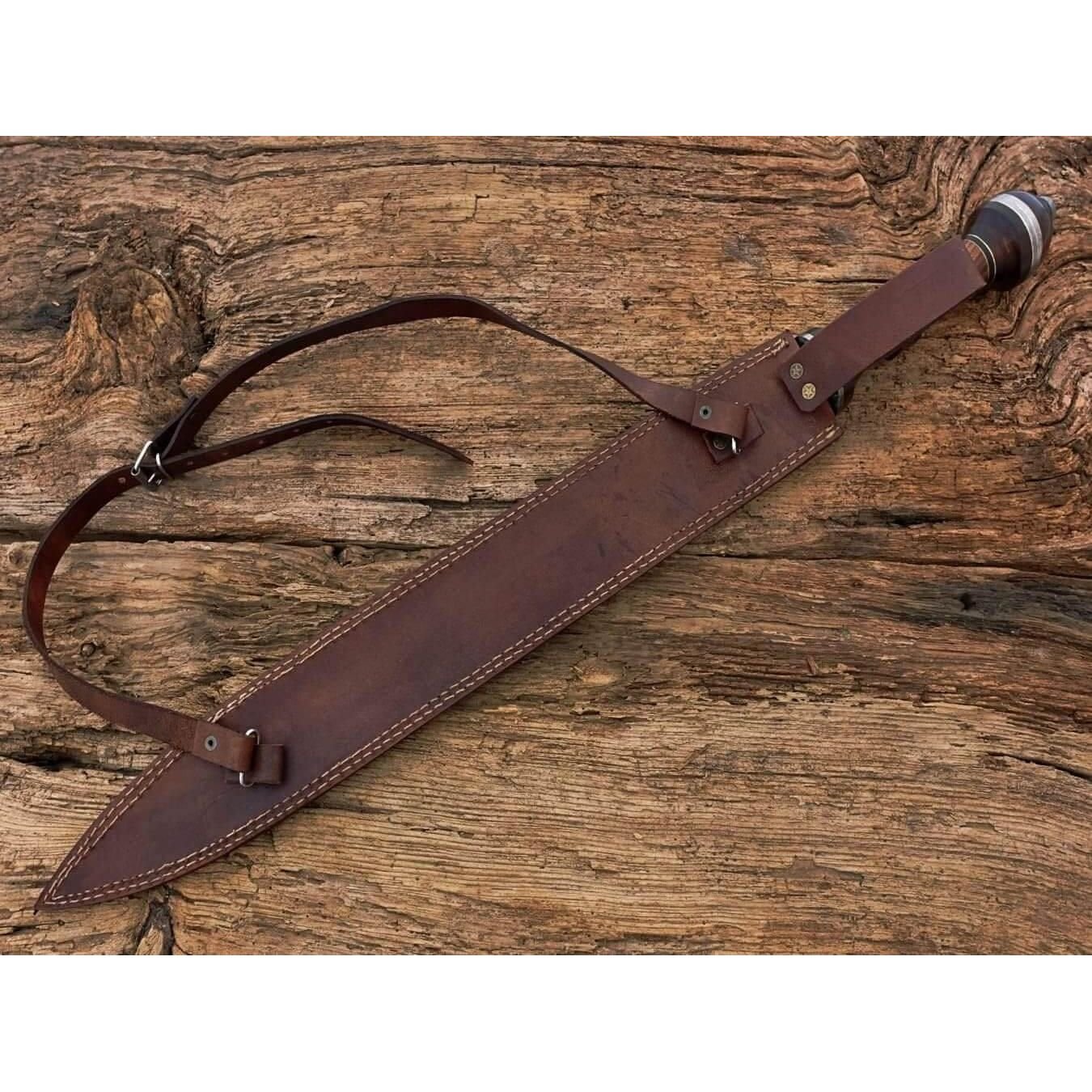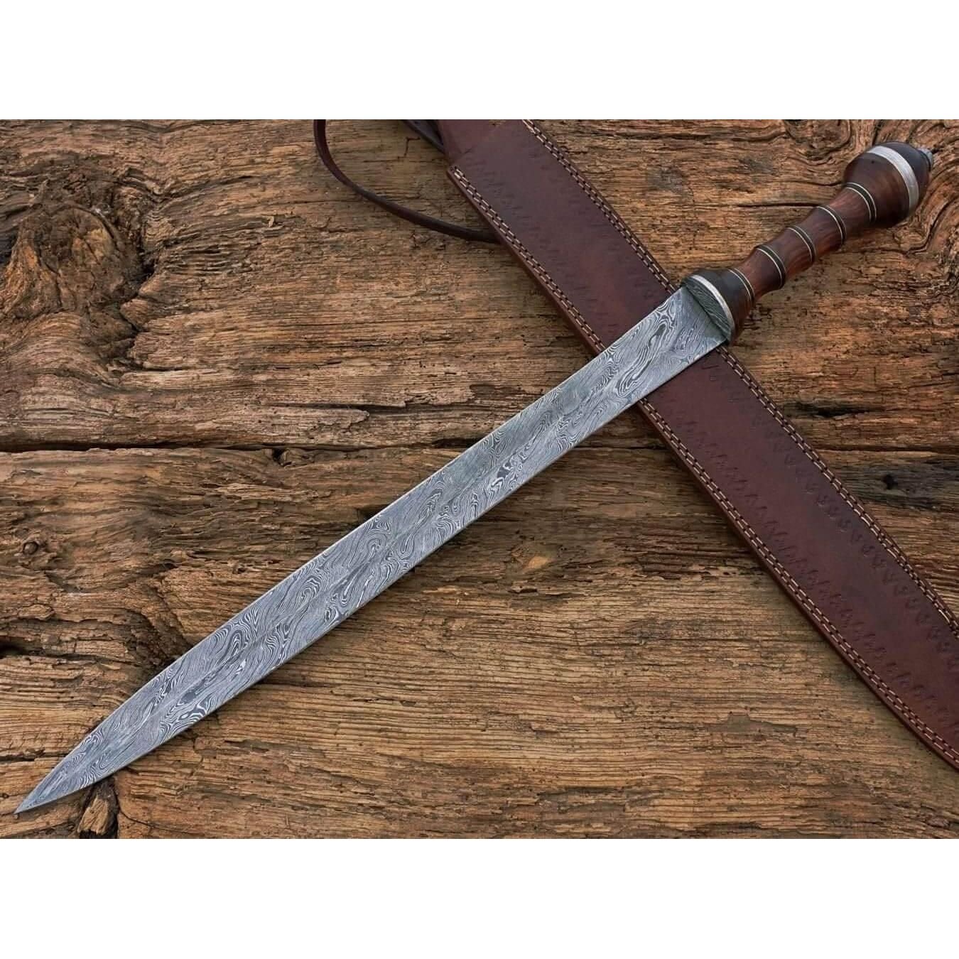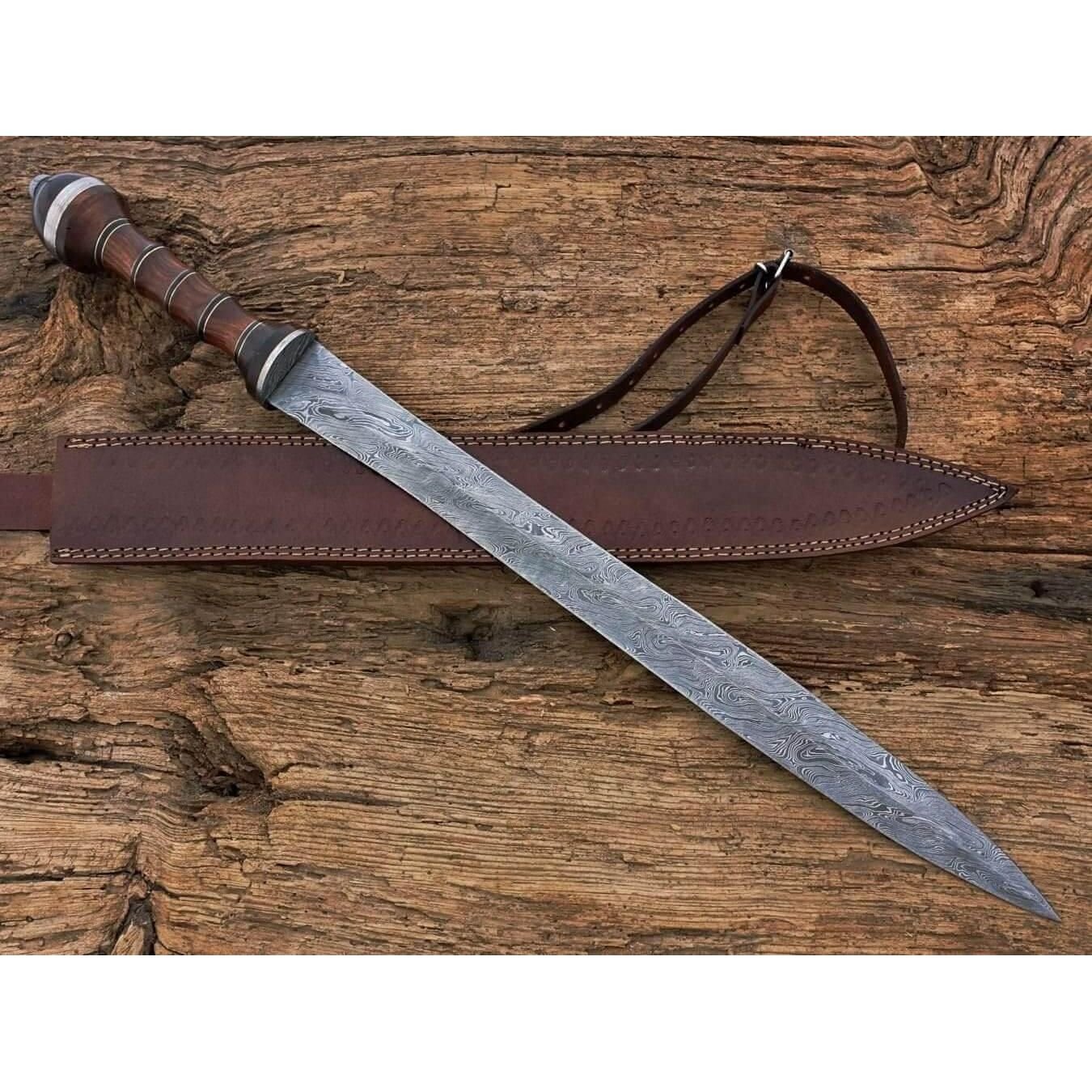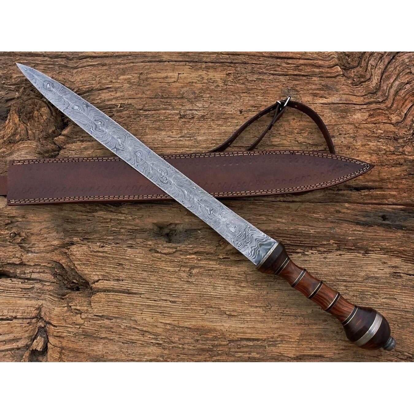 Hand Forged Damascus Roman Gladius sword, Hand Forged Roman Sword. Measurements: Overall Length:30 Inches (approximately) Handle Length: 7 inches (approximately) Blade Length: 23 inches (approximately) Materials used; Handle material: Rose Wood Handle+Damascus Steel Rings. Blade material: Damascus steel. All our Products are Handmade and Unique HOW OUR DAMASCUS IS MADE: All our Damascus is real and not just an acid etch. Damascus is a mixture of 1095HC and 15N20 nickel carbon. You heat them up together and then fold the bar over and over to get the desired layers, ours are 384 layers. Then you burn the blade in acid, and it turns the nickel satin color and the high carbon turns blackish gray. This is how the layers are exposed to show the layers of the new steel created coined “Damascus”. All Damascus is acid etched to show the layers. If you high polish the metal it will be shinny satin like all steels. Only after you burn the sides of the blade with acid do you see the layers of the two steels. Makes sense? After we make our knives we high polish the handles and put an edge on the blade. The high polishing buffs off the acid burned layer of the handle, and the blade edge is sharpened and the acid burned edge becomes satin. CARE / TIPS Blade of Product Should Always Be Clean and Treated With Oil After Every Use. THANK YOU VERY MUCH FOR TAKING INTEREST IN OUR PRODUCTS