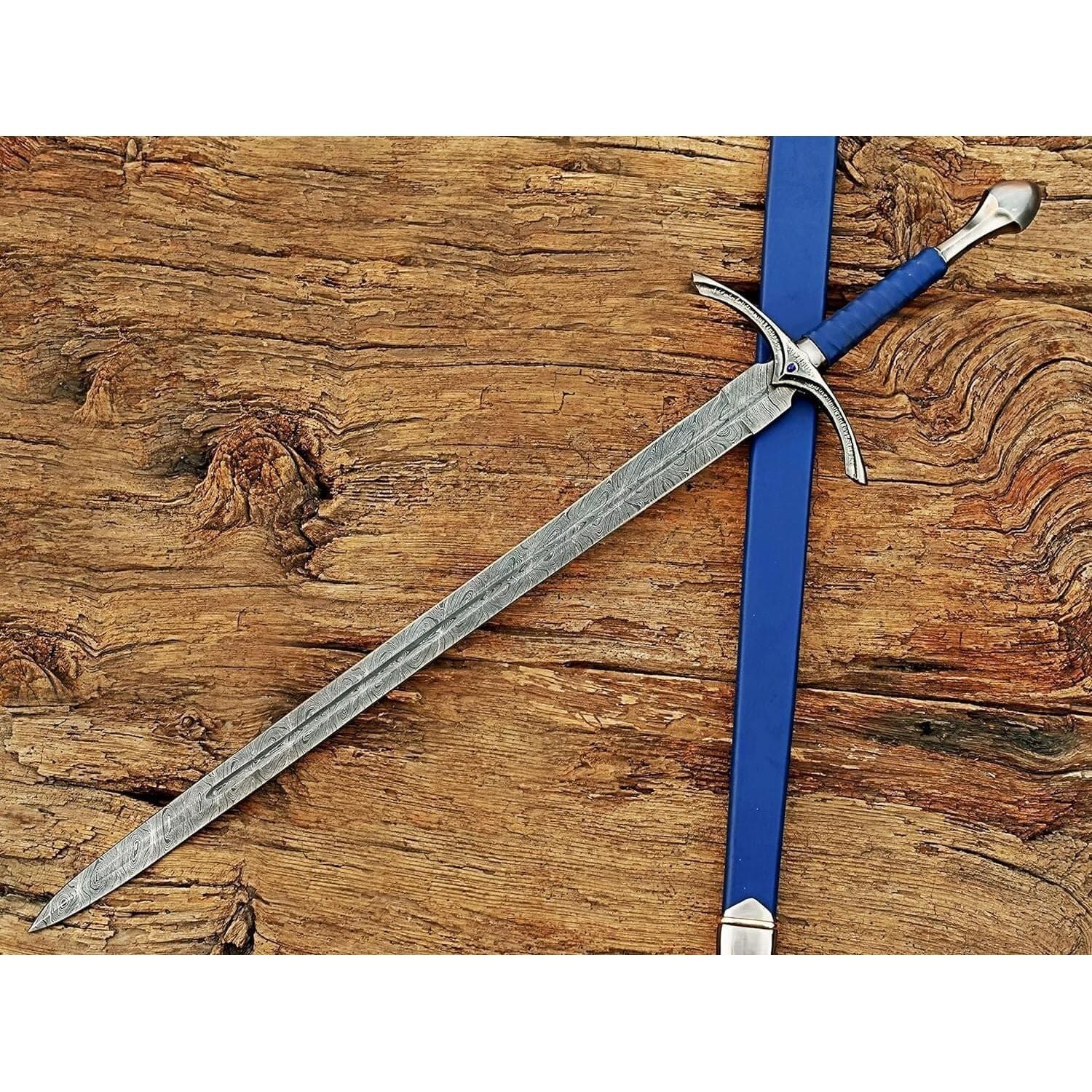 Size & measurements: Overall length: 40 inches Handle length: 10 inches Blade length: 30 inches Blade width: Blade thickness: 4mm Blade hardness: 58-60 HRC Material: Handle material: zinc-casted metal hilt Guard & pommel: zinc-casted Blade material: Damascus steel Blade edge: razor sharp Scabbard: leather sheath