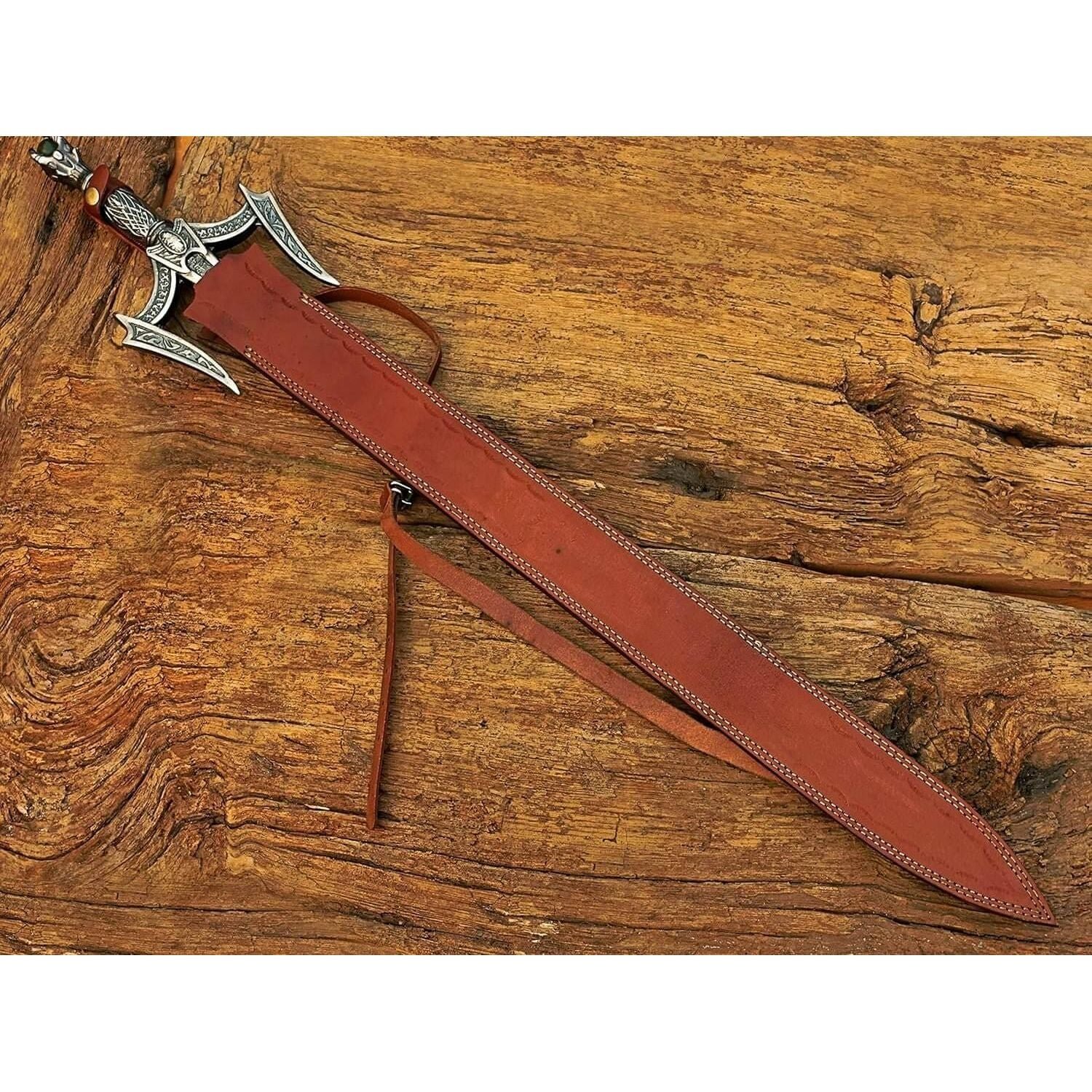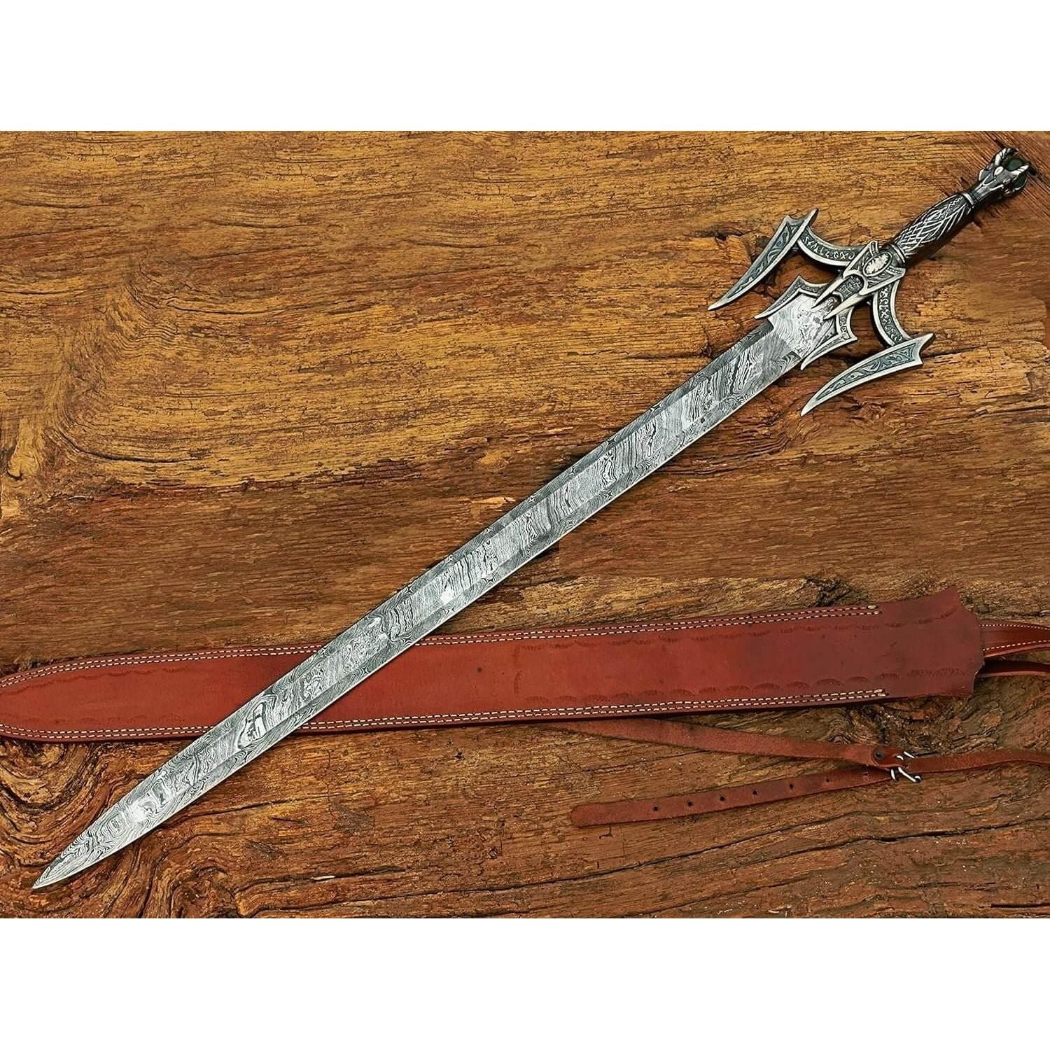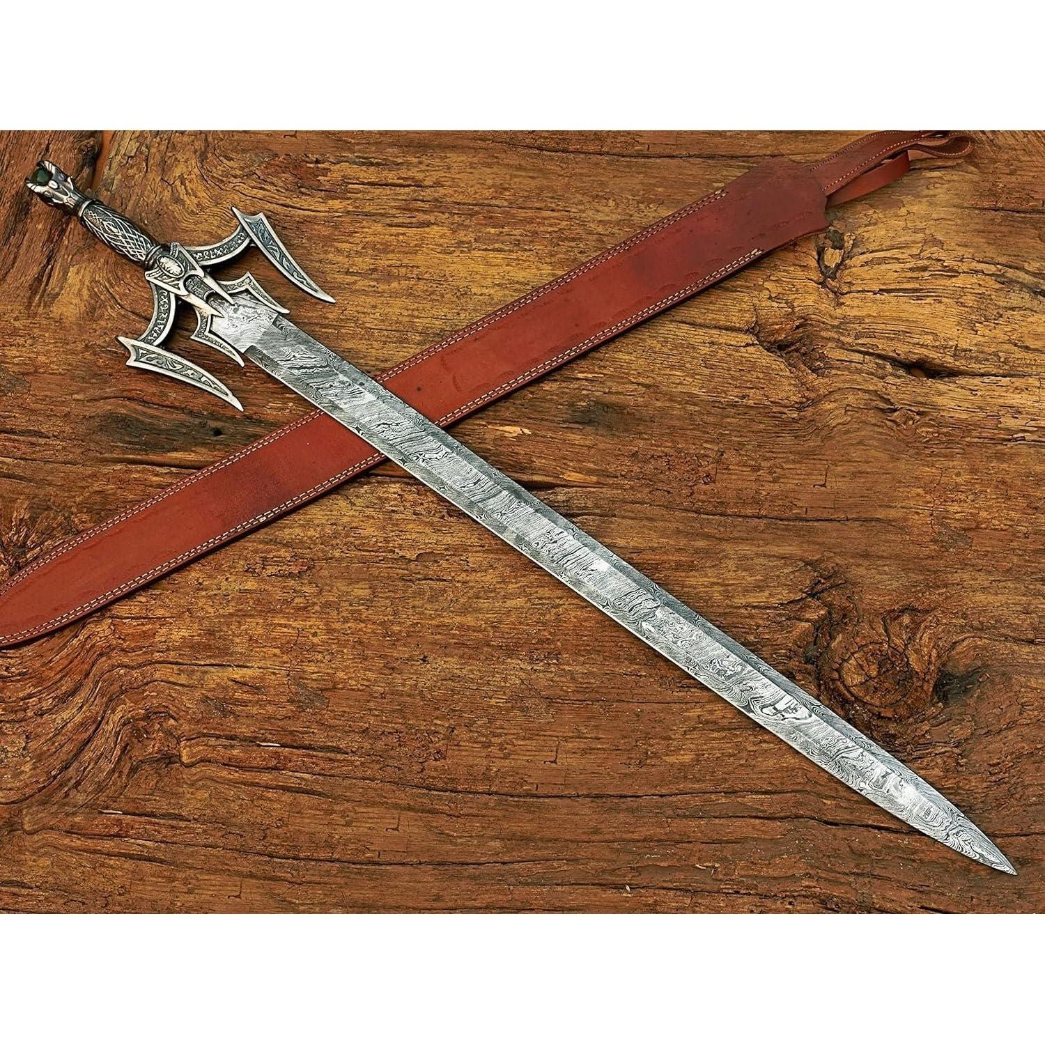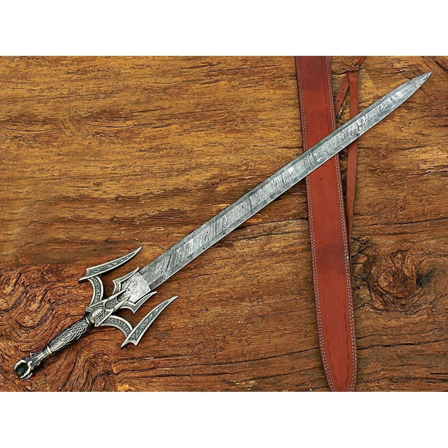 Size & measurements: Overall length: 38 inches Handle length: 8 inches Blade length: 29 inches Blade width: Blade thickness: 4mm Blade hardness: 58-60 HRC Material: Handle material: zinc-casted metal hilt Guard & pommel: zinc-casted Blade material: Damascus steel Blade edge: razor sharp Scabbard: leather sheath