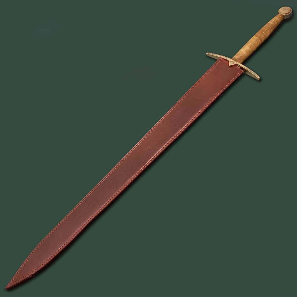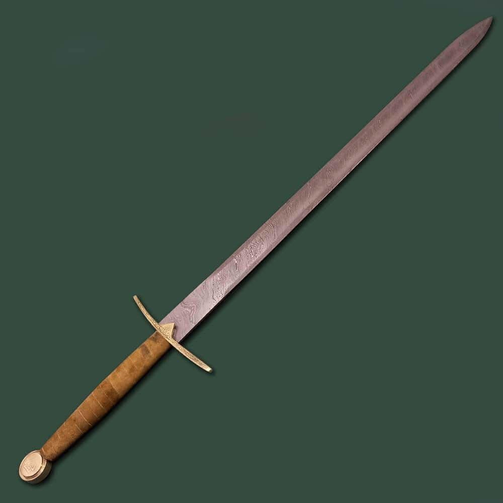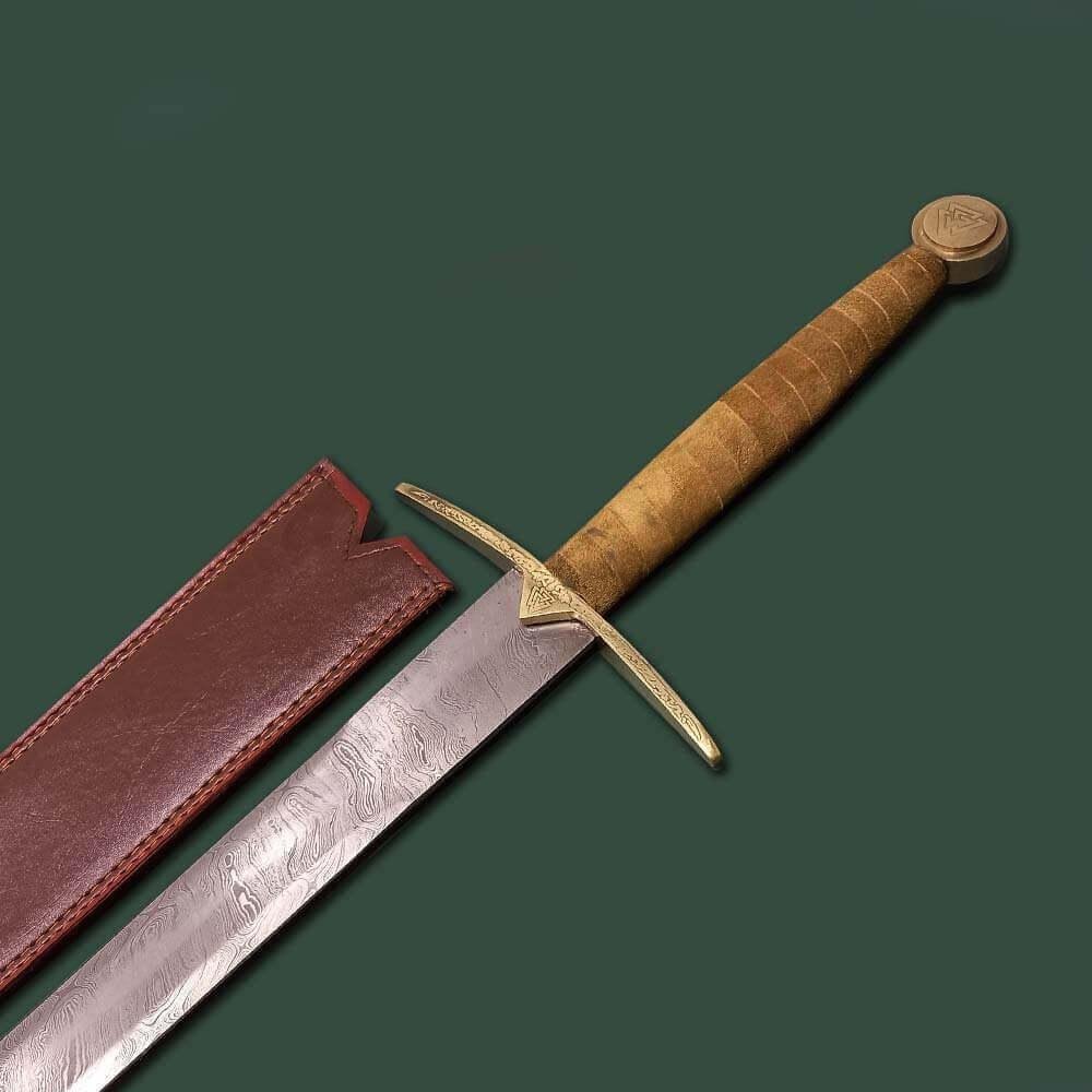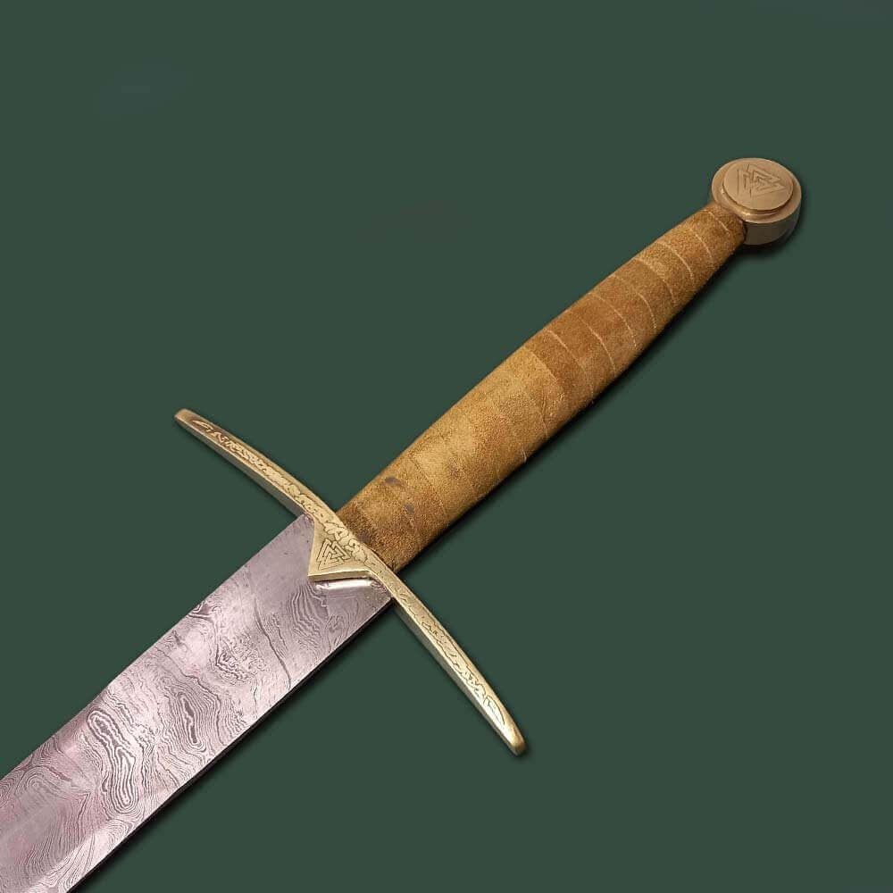 In Norse Mythology, Einherjar (pronounced “ane-HAIR-yar”) are those who fought valiantly on the battlefield but ultimately perished. The Valkyrie brings these mighty warriors to the gates of Valhalla to be a part of Odin’s elite army. This full tang sword is what I would picture for them to be using when they charge into battle. Forged of excellent-quality Damascus Steel with a whopping 400-520 layers, an HRC of 58-60, and steel of 1095/15N20, this sword was built for only the mightiest of warriors and is sharpened to perfection. the intriguing wave-like pattern of the Damascus gives this sword an even more deadly look as if it needed any help. The handle is wrapped in exquisite genuine leather. The hand guard and pommel are both made of pure brass, with the guard etched with beautiful Norse engraving and the Pommel having the symbol Valknut, which is the slain warrior knot. Included is an expertly-crafted over the shoulder leather sheath that has a belt look and two snap closures to keep your sword from moving or falling out when not in use. The Valknut symbol is also on the sheath.