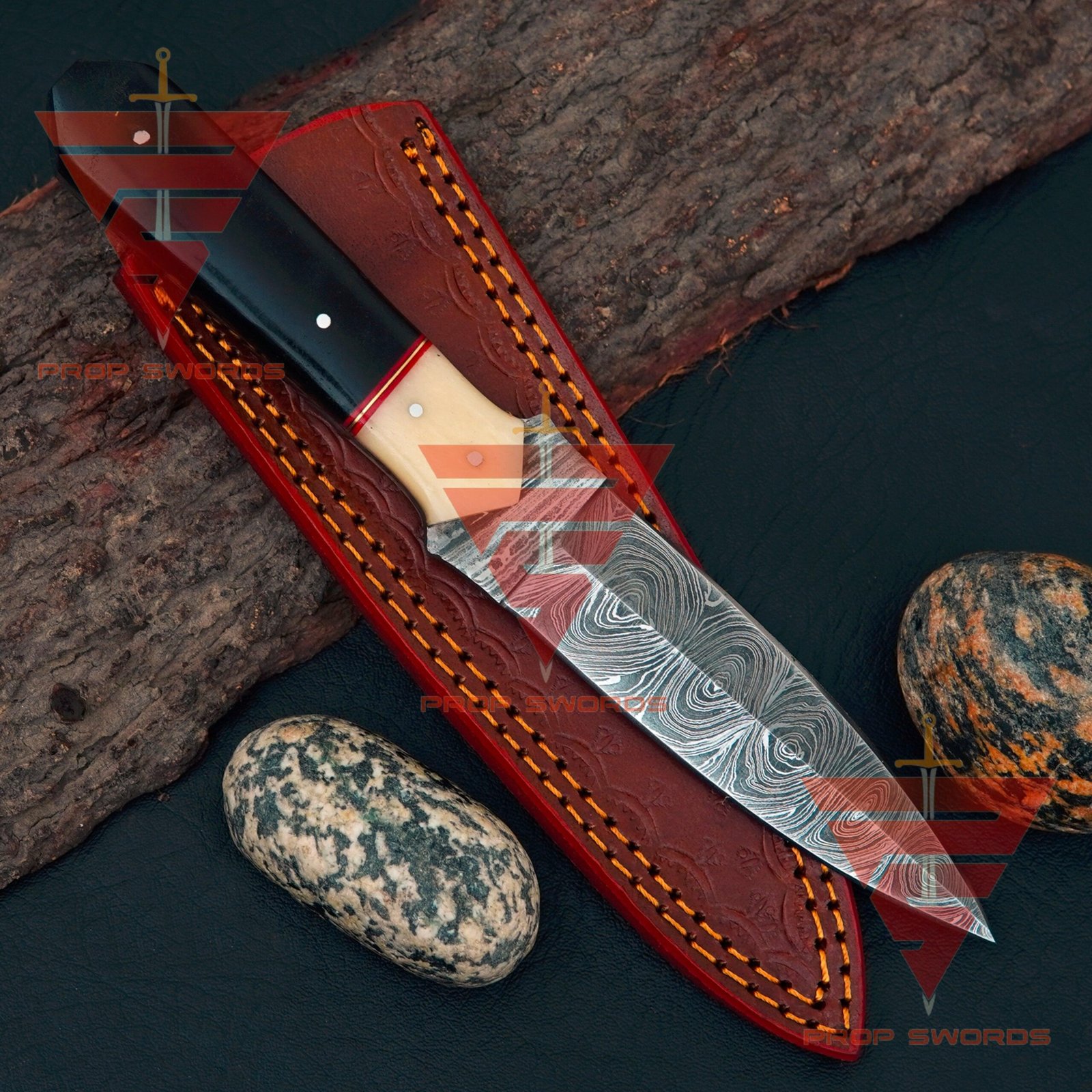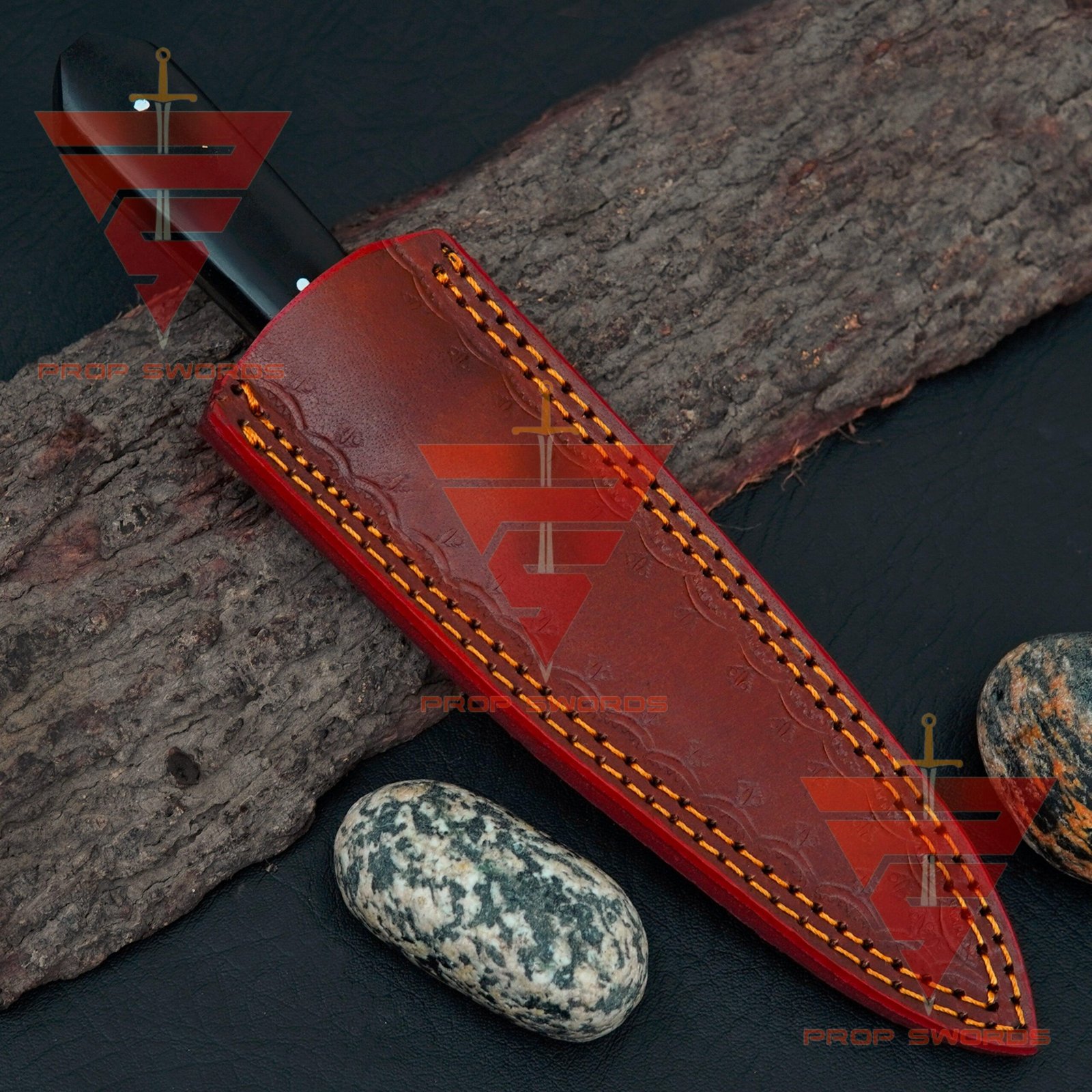 The Damascus steel blade ensures unparalleled durability and strength, while the intricate handle design adds a touch of elegance to the overall aesthetic. Each knife comes complete with a high-quality pure leather sheath for added protection and convenience.