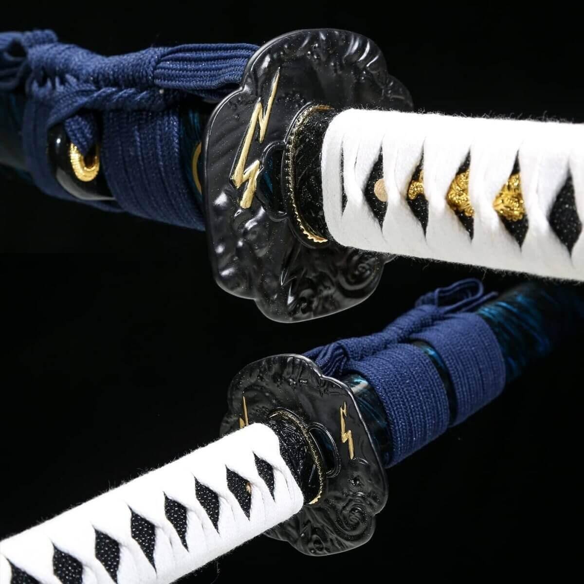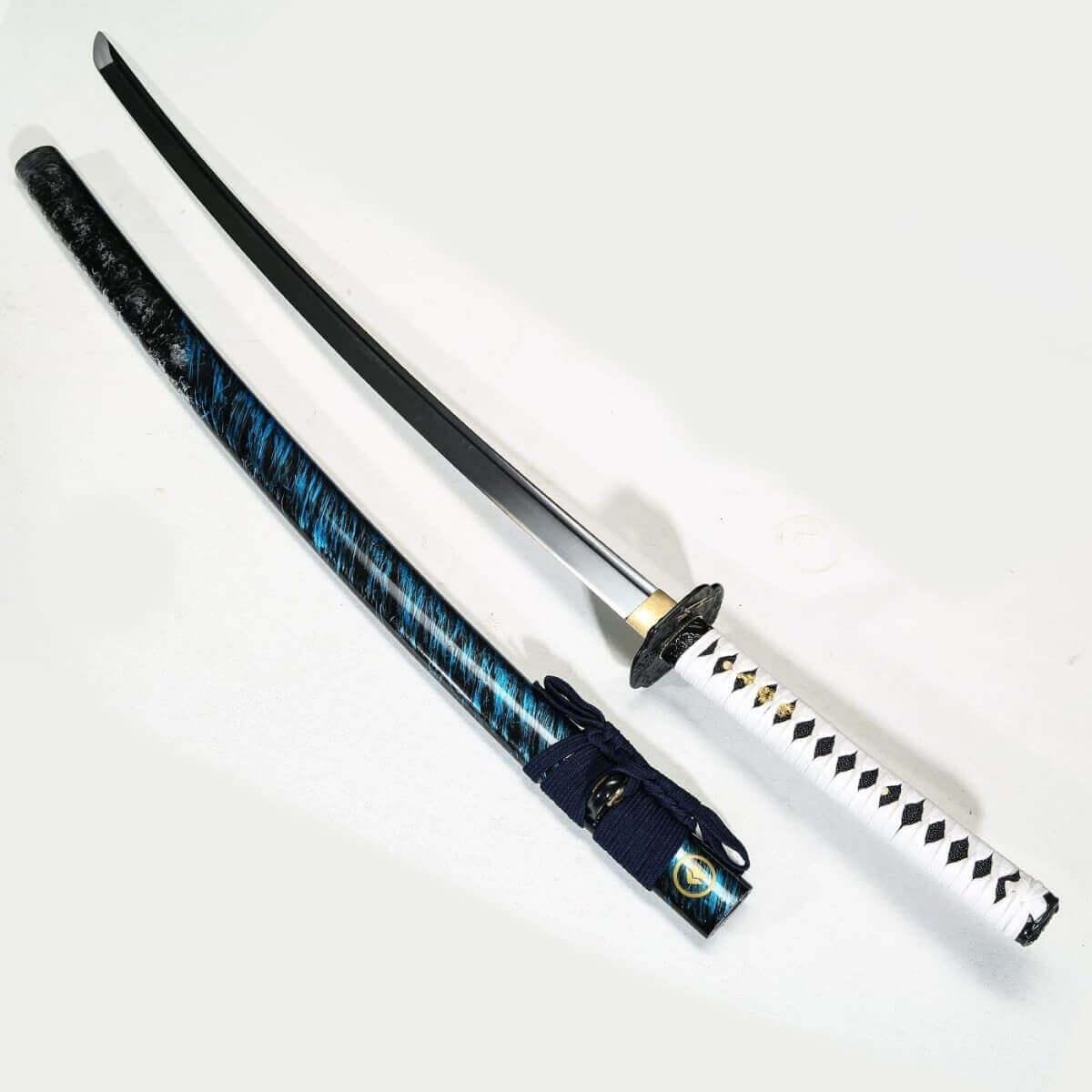 The handle of samurai Dao is made in the entire Tang Dynasty and takes on composite Tsukuba plan. Compound design habaki (cutting edge neck). It is gotten by two seppa (shims). The handle is fixed by two bamboo nails. The wooden handle is covered with white impersonation fish skin and white fiber rayon. (saya) the sheath is made of top notch wood and paint. What’s more, it’s covered with excellent rayon.