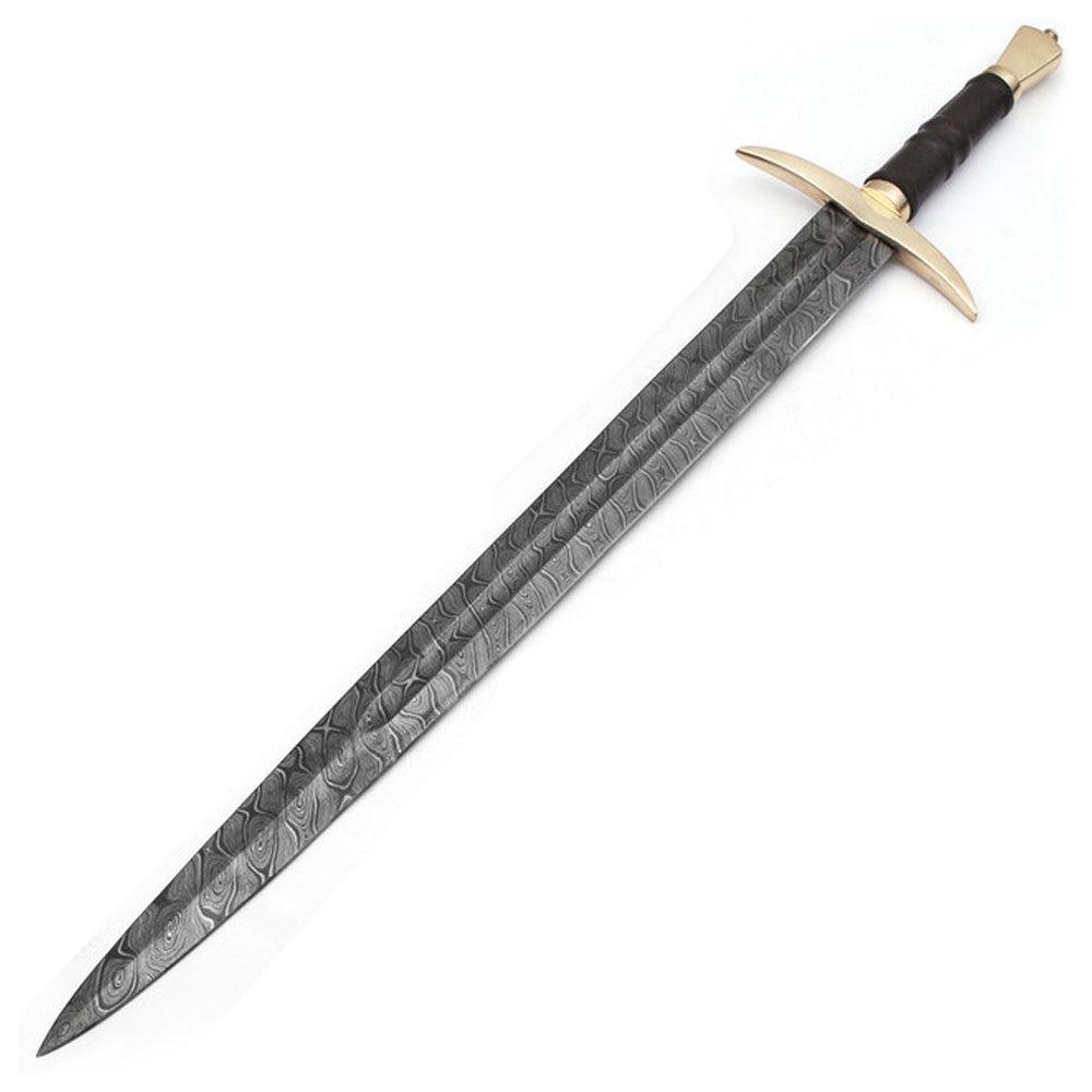 Handmade Damascus steel sword is made of 1095/15N20 that has been folded & layered approximately 400-520 times to create the intriguing wave-like pattern. Damascus Steel is sought after not only for its looks, but for its durability as well as flexibility. The handle is made of Wood on Leather Stitched With Brass Guard & Pommel. Included with leather sheath with back strap.