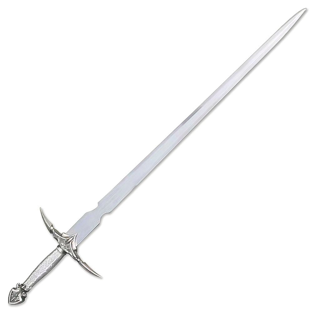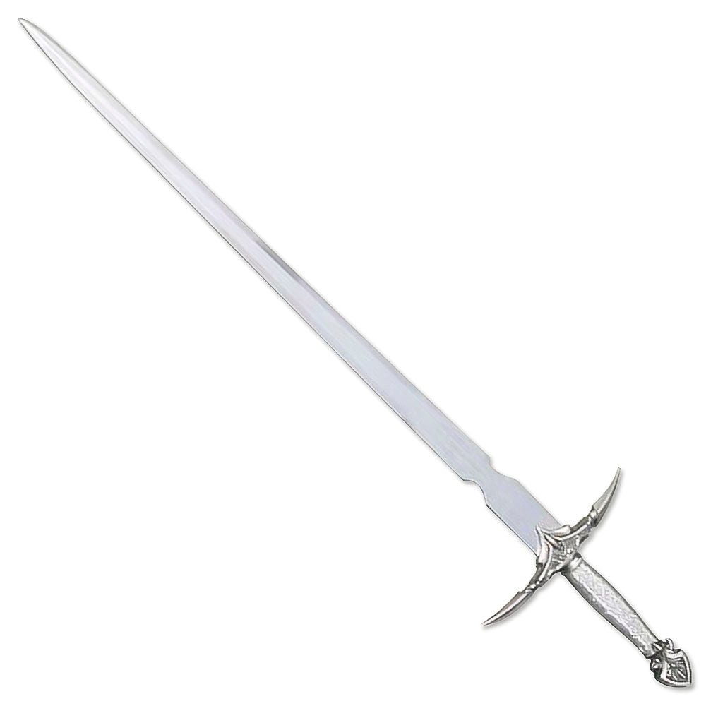 The hilt is where fantasy truly comes alive—elaborately sculpted with intricate motifs, it includes an ornate crossguard with sweeping, claw-like curves and a rune-etched handle that reflects ancient power. The pommel complements the sword’s aggressive, otherworldly aesthetic, making it a stunning centerpiece in any collection.