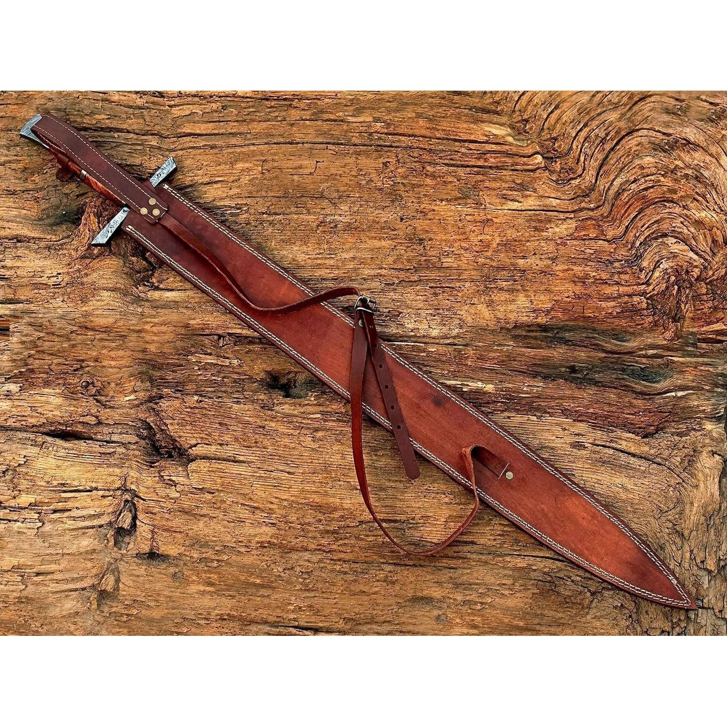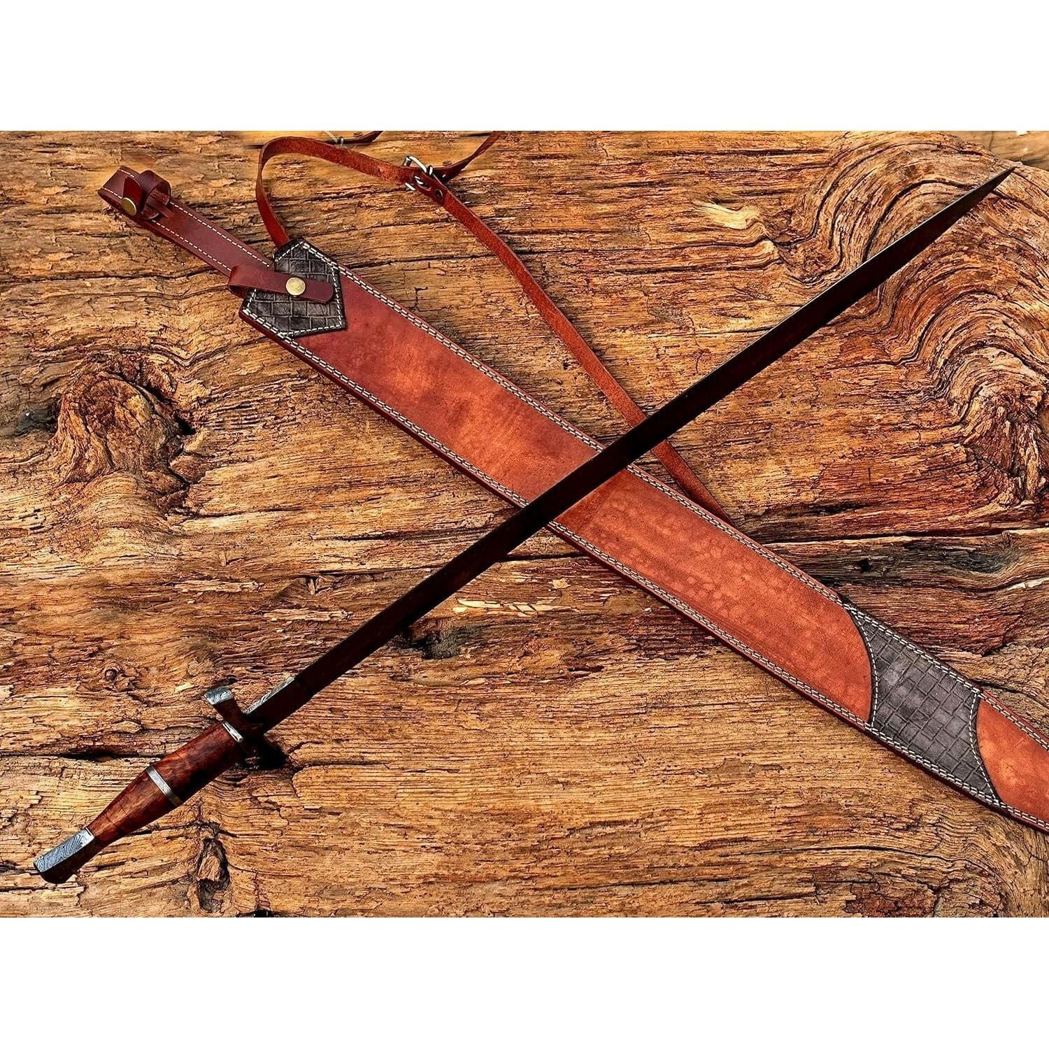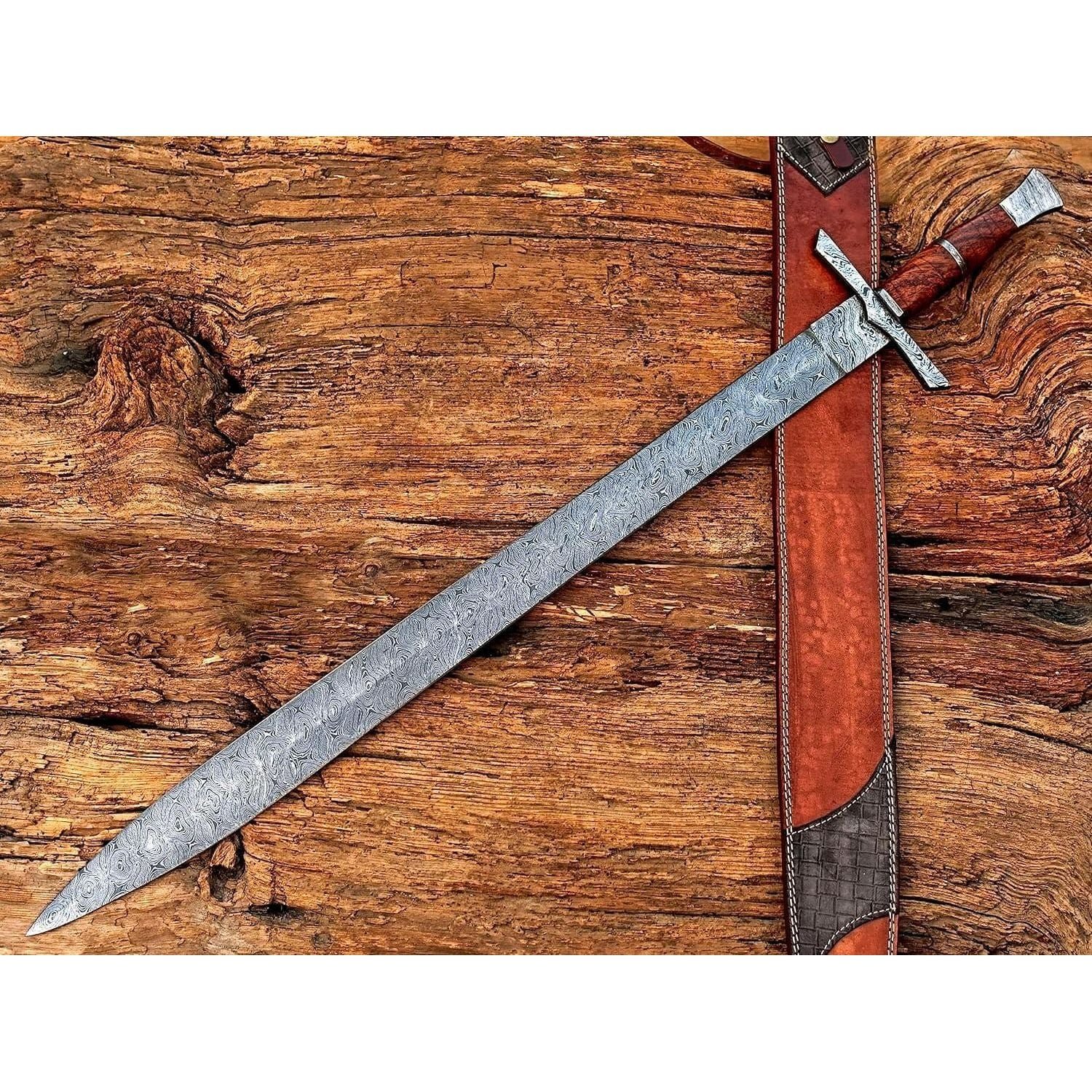 Size & measurements: Overall length: 38 inches Handle length: 8 inches Blade length: 28 inches Blade width: Blade thickness: 4mm Blade hardness: 58-60 HRC Material: Handle material: Rose Wood Guard & pommel: Damascus Steel Blade material: Damascus steel Blade edge: razor sharp Scabbard: leather sheath