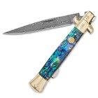 Experience the unrivaled quality of Kissing Crane knives first-hand with their genuine abalone family of knives. This Stiletto offers elegant, genuine abalone handle scales, and each looks different. Each knife is accented by brass-plated pins and bolsters and features a 4 1/4” razor-sharp Damascus steel blade with the world-renowned Kissing Crane logo stamped right on the blade.