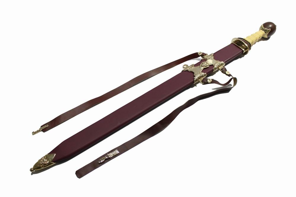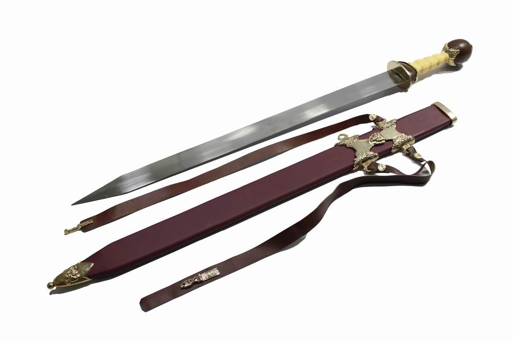 he Maximus Gladius from the movie “Gladiator” is a fictional interpretation of a Roman gladius, the short sword used by Roman soldiers. While it’s inspired by historical swords, it incorporates design elements and a length more akin to a spatha, a longer sword that came into use later. The movie sword features a polished wooden pommel and guard, often with brass fittings, and a faux bone or ivory handle. It’s typically depicted with a leather scabbard and baldric.