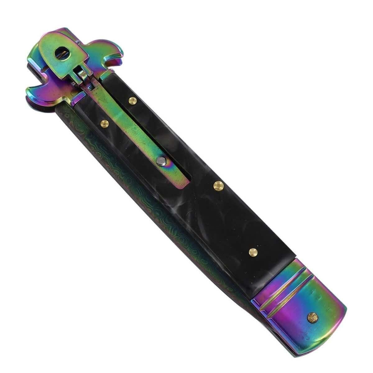 The exemplary stiletto just got a totally different look. This captivating blade has the quality and magnificence of Damascus steel while likewise having a perfect titanium finish. The sharp edge is produced using 1095/15N20 prepares with roughly 176-180 layers and a Rockwell rating between 54-60. The Damascus example and titanium rainbow finish make the sharp edge look like it has harmful characteristics (in the most effective way conceivable, obviously). The titanium is seen all through the blade. The handle is produced using tough ABS mounts and has a smooth dark marble look that praises the rainbow well. Metal pins hold the mounts set up. Included is a smaller dark nylon sheath with a waist band connection.