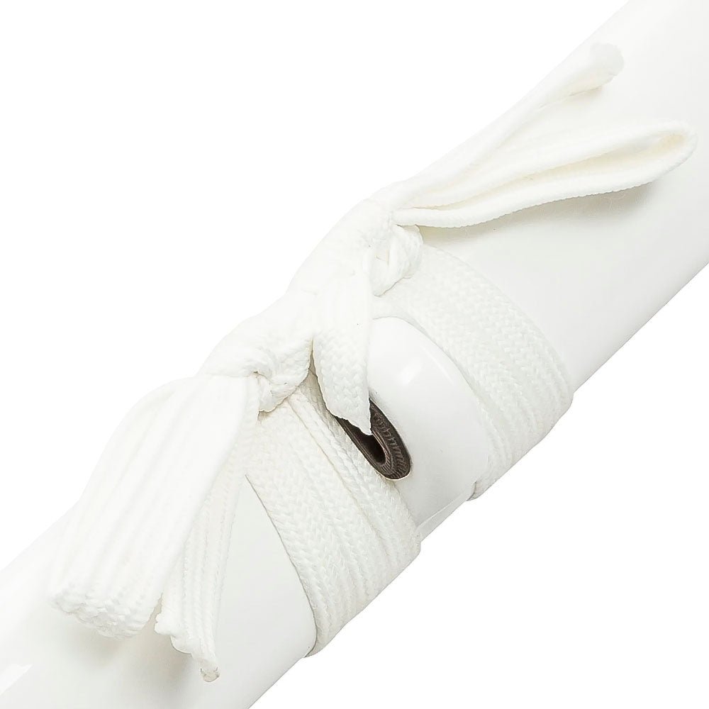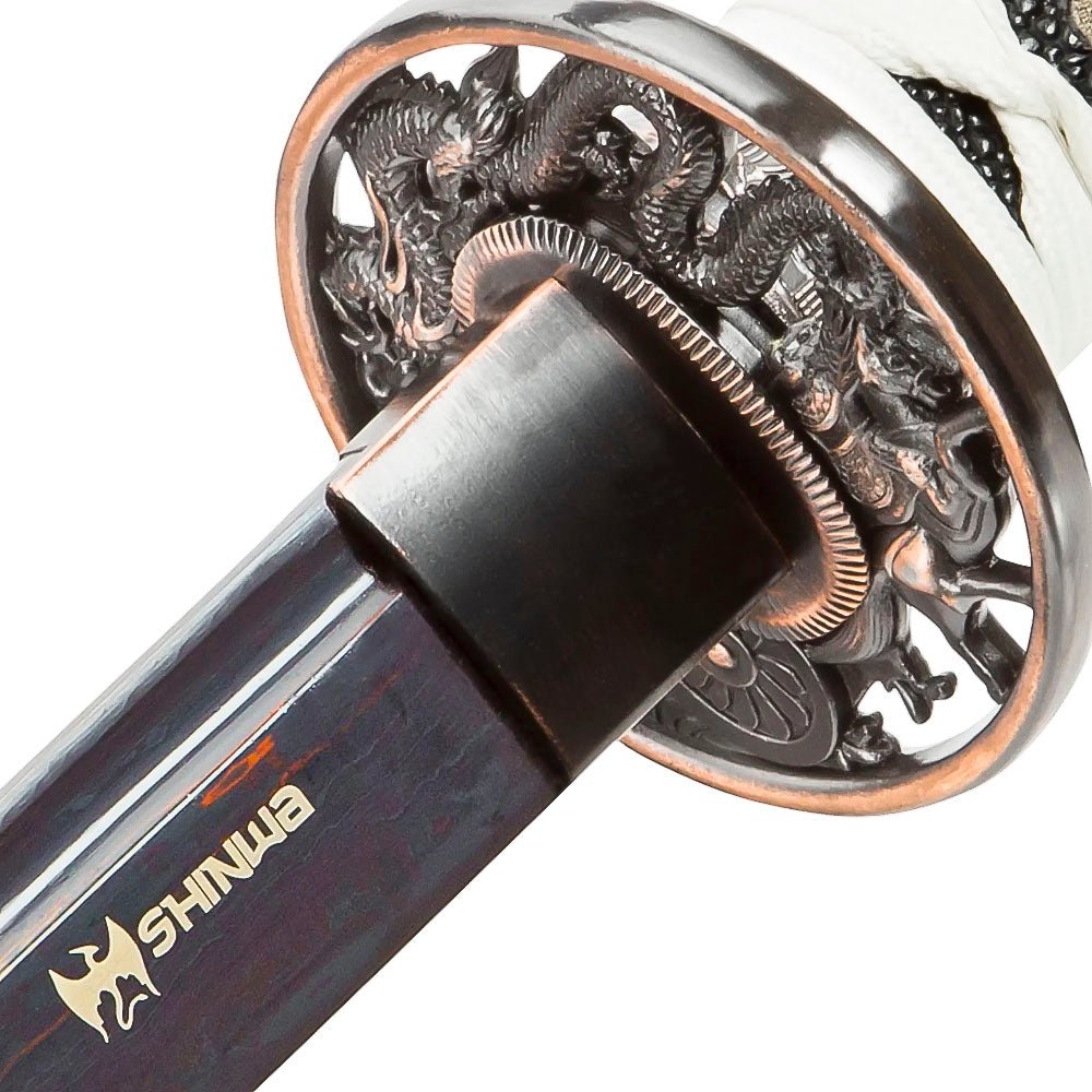 The Shinwa White Knight Black Damascus Sword is a masterful blend of strength and artistry, crafted to captivate both collectors and martial artists. Featuring a 28 3/4” black Damascus steel blade, this katana showcases intricate wave patterns forged into the steel, symbolizing both elegance and power. With an overall length of 41 3/4”, this sword is a commanding piece that pays homage to traditional Japanese craftsmanship while embracing modern durability and style. Designed for performance and display, the full-tang construction ensures exceptional balance and strength, while the faux ray skin handle provides a secure and comfortable grip. The black tsuba and contrasting white handle accents create a striking visual aesthetic. Whether displayed as a centerpiece or used in practice, the Shinwa White Knight Black Damascus Sword embodies the essence of the warrior’s spirit.