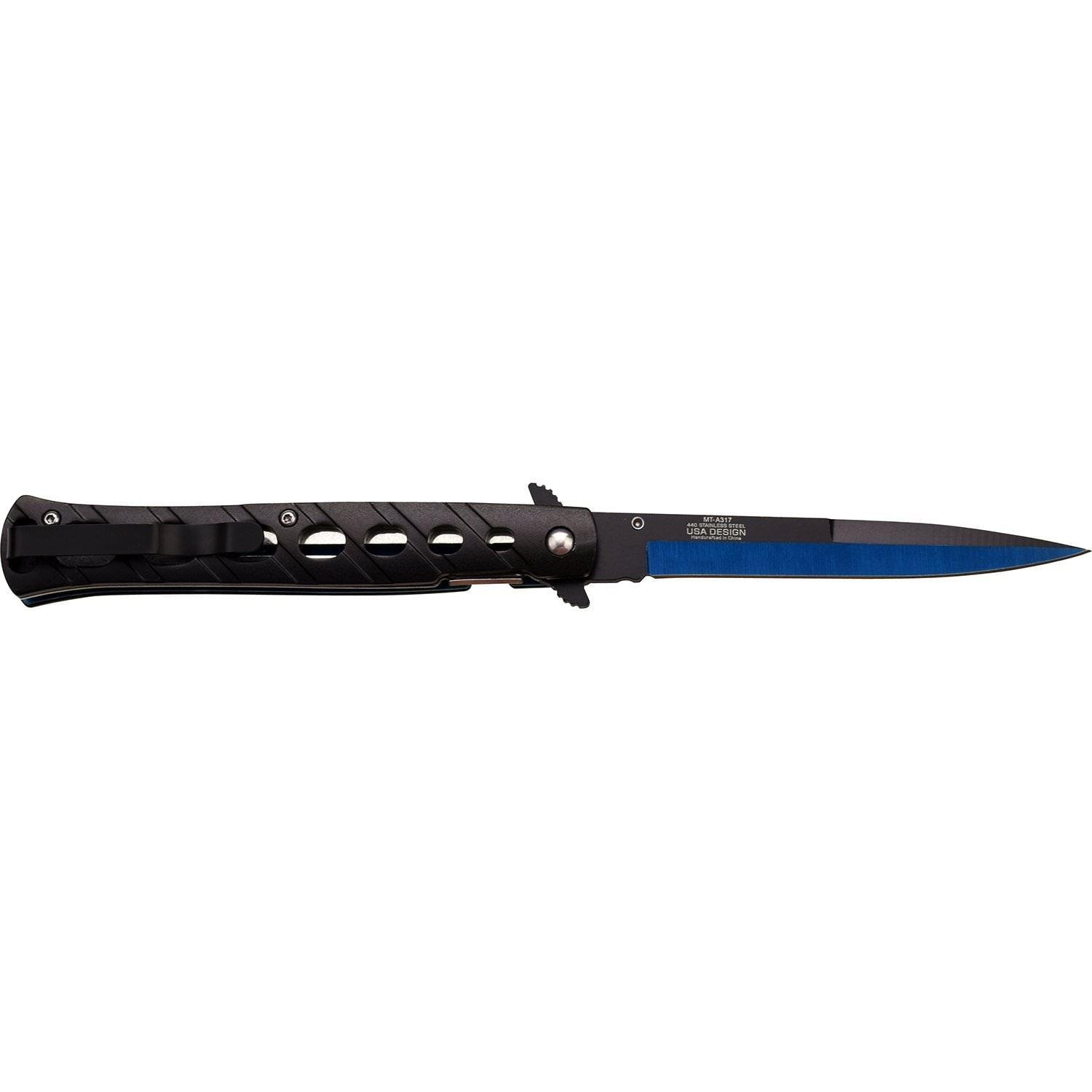 This MTech USA Ballistic features a 4 inch blue and black stainless steel blade. The handle is black aluminum with a blue liner. This knife is spring assisted and comes with a pocket clip for easy carry.