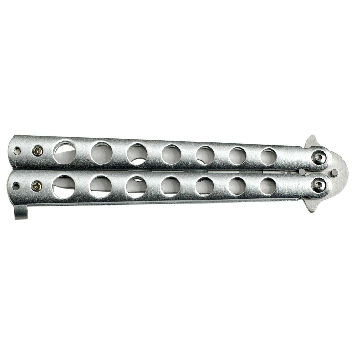 Sporting a Silver finished clip point blade, the slim build and good weight of this Balisong butterfly knife delivers nice action in an attractive package. The distinctive Sliver stainless steel handle is decorated with circular cutouts making this knife very light in weight but at the same time extremely Durable. A metal safety latch is included to lock the Blade into place when it is not in use as well as when it is deployed.ÂSpecifications