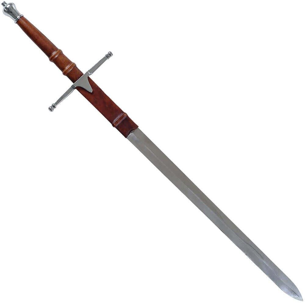 This is a beautiful replica of Scottish Claymore like the one used by the famous Sir William Wallace of Scotland. It features a gorgeous stainless-steel blade with a leather-wrapped ricasso guard at the base. The elegant hilt is made up of a tapered wood handle wrapped in leather, as well as a shiny aluminum alloy cross guard and pommel. This decorative piece is great for realistic-looking costumes and is sure to impress your friends on display as well.
