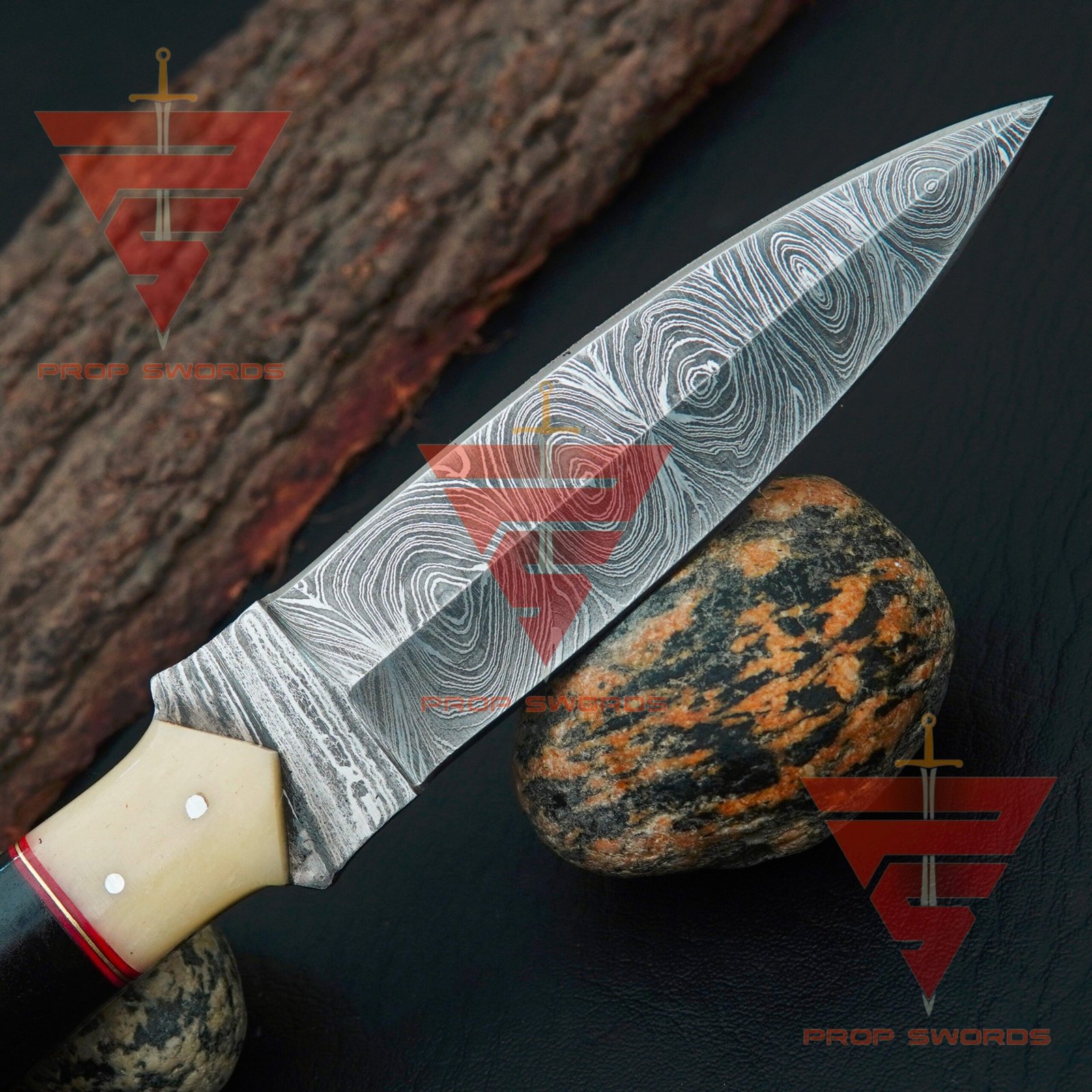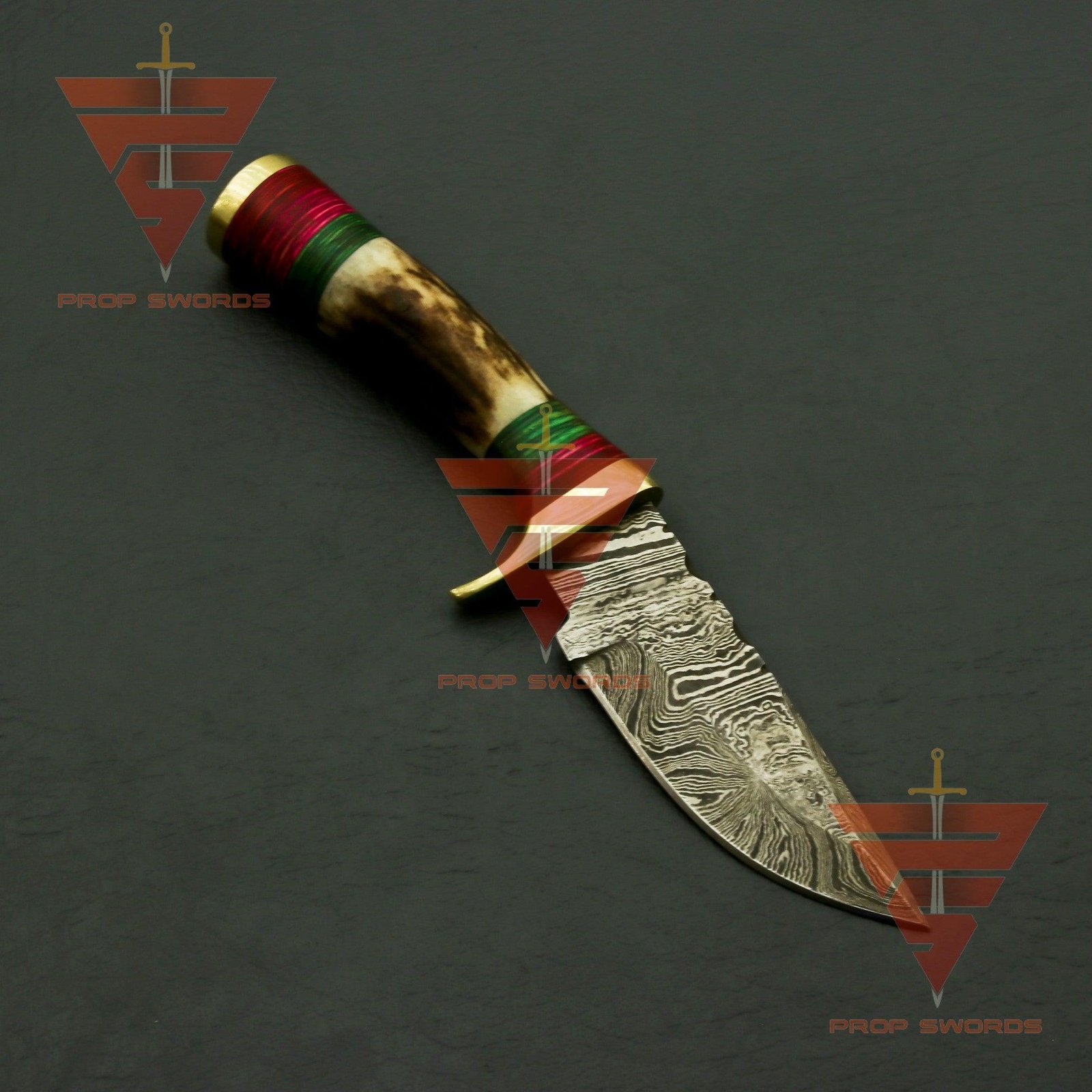 Exquisite Handcrafted Damascus Steel Hunting Knife with Rat-Tail Stag Horn Bolster Handle, and Leather Sheath: A Timeless Gift For Him